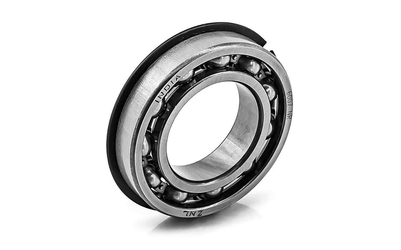Шариковый подшипник, с канавкой и стопорным кольцом в сборе NR, однорядный радиальный открытый, c представляет собой шарикоподшипник с одним рядом шариков, предназначенный в основном для восприятия радиальных нагрузок и небольших осевых нагрузок в обоих направлениях. С канавкой и стопорным кольцом в сборе NR. При такой конструкции, подшипник сразу готов к фиксации в корпусе, стопорное кольцо жёстко ограничивает его осевое перемещение по наружному диаметру, применяется, когда установка не предусматривает фланец на корпусе или опорную гайку на валу, а осевая фиксация нужна именно по наружной обойме. Без стопорного кольца можно устанавливать, как обычный подшипник, канавка никак не влияет на работу подшипника. Внутреннее и наружное кольца имеют глубокие дорожки качения, а сепаратор удерживает шарики на равных расстояниях друг от друга. Открытость конструкции означает отсутствие уплотнений и защитных шайб, что обеспечивает низкое трение и простоту смазывания, но требует более тщательной защиты от загрязнений, может работать в масляной ванне. Такие подшипники применяются в электродвигателях, вентиляторах, редукторах и других узлах, где важны высокие скорости вращения и минимальные потери на трение.