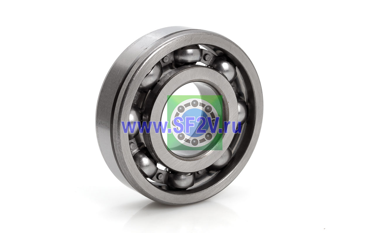 Шариковый подшипник, c проточкой под стопорное кольцо N, однорядный радиальный открытый, c представляет собой шарикоподшипник с одним рядом шариков, предназначенный в основном для восприятия радиальных нагрузок и небольших осевых нагрузок в обоих направлениях. С канавкой под стопорное кольцо N. Для её использования, дополнительно нужно установить наружное стопорное кольцо. При такой конструкции, подшипник сразу готов к фиксации в корпусе, стопорное кольцо жёстко ограничивает его осевое перемещение по наружному диаметру, применяется, когда установка не предусматривает фланец на корпусе или опорную гайку на валу, а осевая фиксация нужна именно по наружной обойме. Без стопорного кольца можно устанавливать, как обычный подшипник, канавка никак не влияет на работу подшипника. Внутреннее и наружное кольца имеют глубокие дорожки качения, а сепаратор удерживает шарики на равных расстояниях друг от друга. Открытость конструкции означает отсутствие уплотнений и защитных шайб, что обеспечивает низкое трение и простоту смазывания, но требует более тщательной защиты от загрязнений, может работать в масляной ванне. Такие подшипники применяются в электродвигателях, вентиляторах, редукторах и других узлах, где важны высокие скорости вращения и минимальные потери на трение.