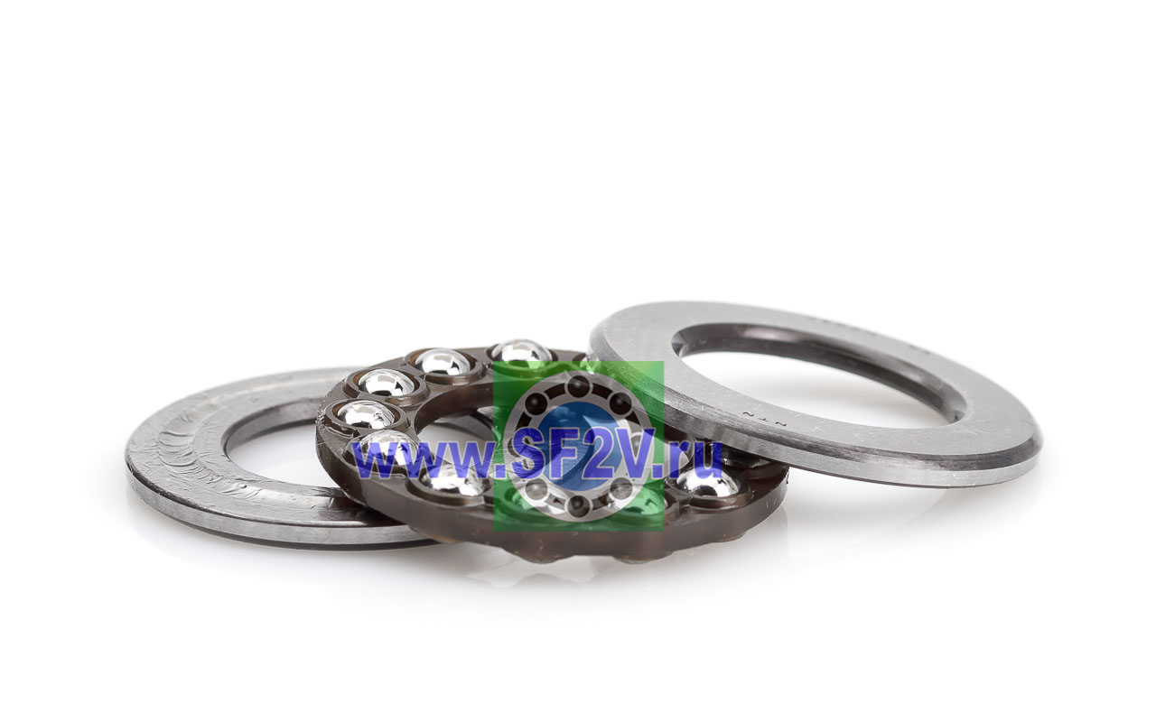 Упорный шарикоподшипник одинарный разборный. Воспринимают только осевые нагрузки и жестко фиксируют положение вала. Применимы для опор тихоходных валов, задвижек, крюков мостовых кранов, поворотных и нажимных устройств и т.д.