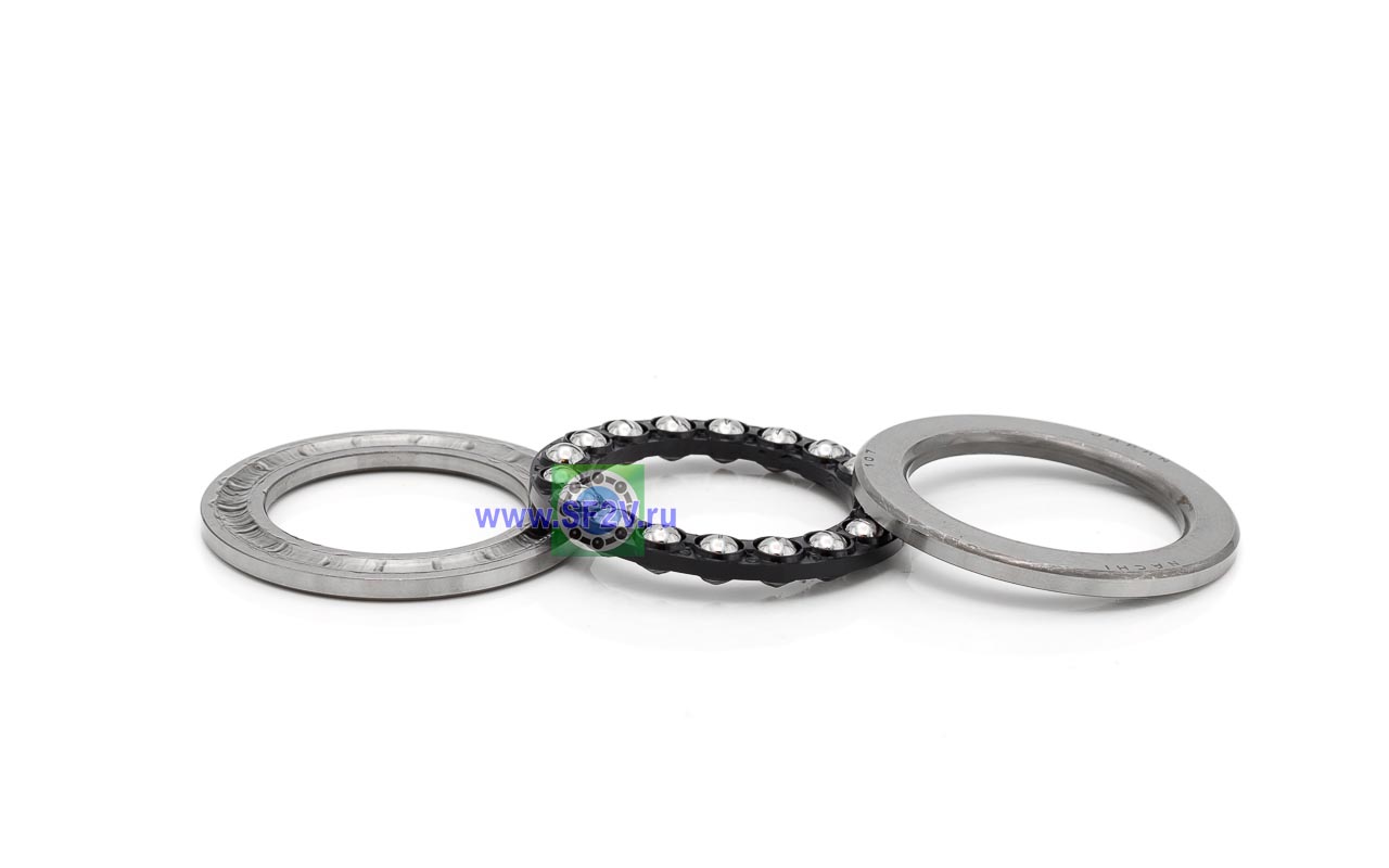 Упорный шарикоподшипник одинарный разборный. Воспринимают только осевые нагрузки и жестко фиксируют положение вала. Применимы для опор тихоходных валов, задвижек, крюков мостовых кранов, поворотных и нажимных устройств и т.д.