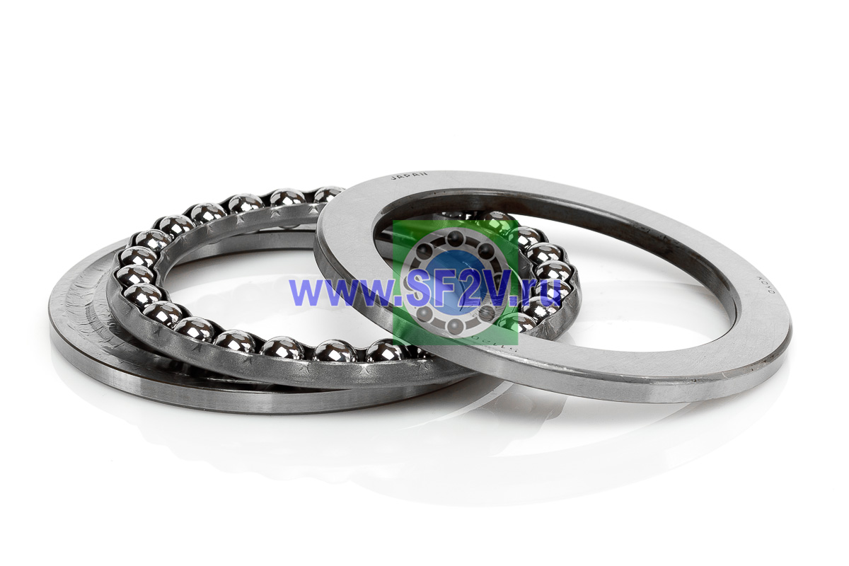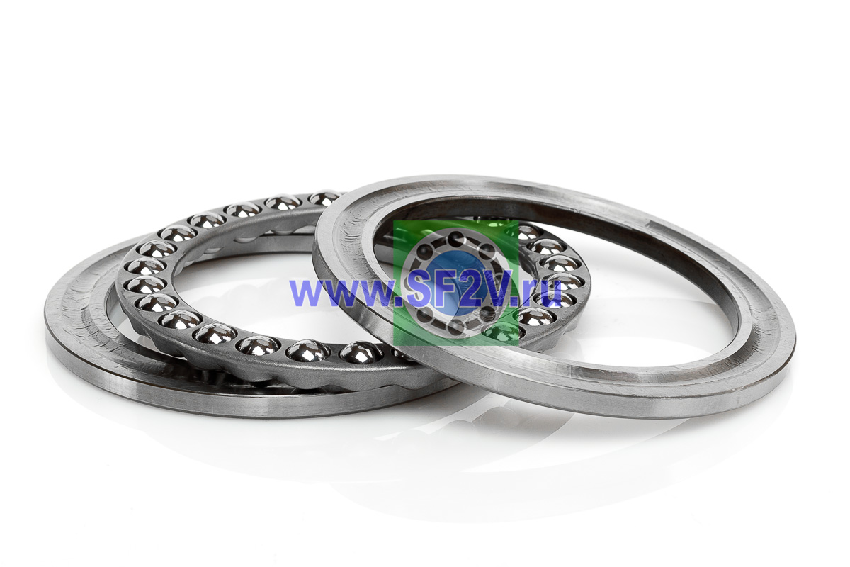 Упорный шарикоподшипник одинарный разборный. Воспринимают только осевые нагрузки и жестко фиксируют положение вала. Применимы для опор тихоходных валов, задвижек, крюков мостовых кранов, поворотных и нажимных устройств и т.д.