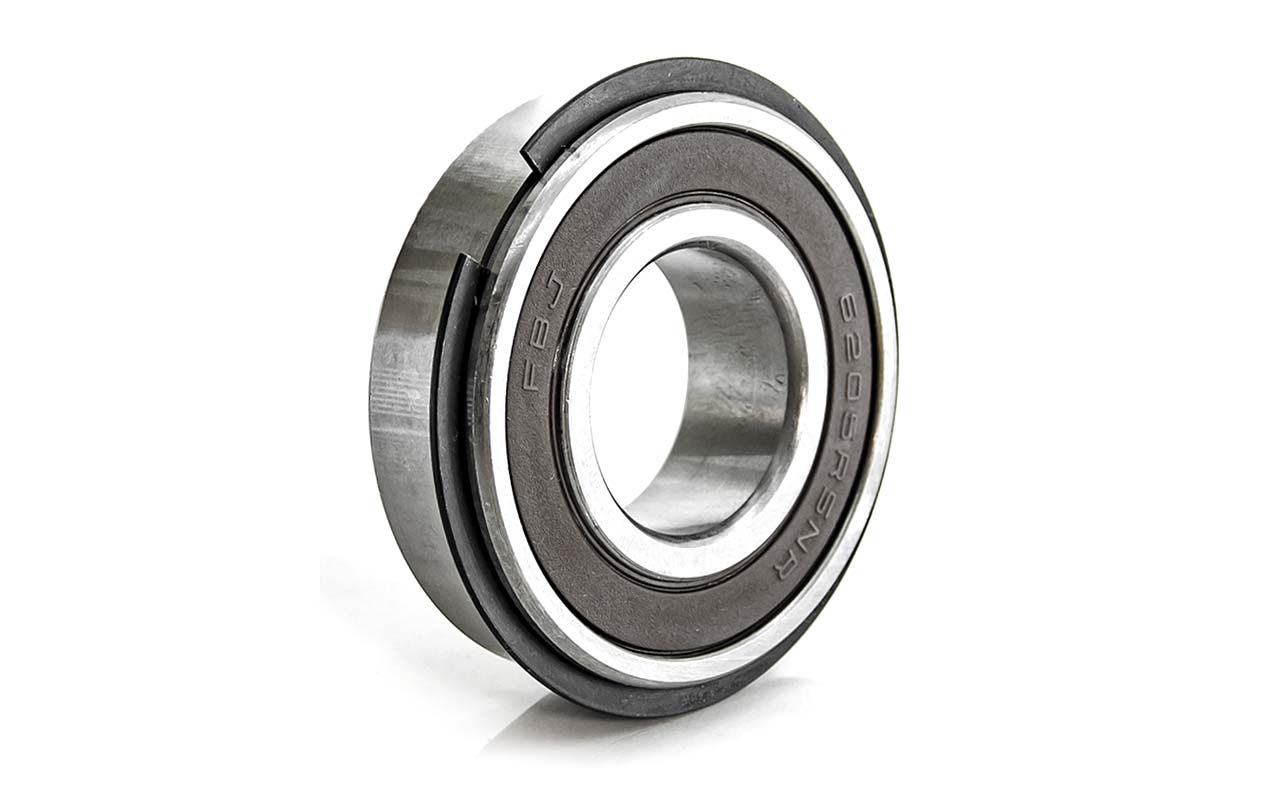 Шариковый подшипник, с канавкой и стопорным кольцом в сборе NR, однорядный радиальный открытый, c представляет собой шарикоподшипник с одним рядом шариков, предназначенный в основном для восприятия радиальных нагрузок и небольших осевых нагрузок в обоих направлениях. С канавкой и стопорным кольцом в сборе NR. При такой конструкции, подшипник сразу готов к фиксации в корпусе, стопорное кольцо жёстко ограничивает его осевое перемещение по наружному диаметру, применяется, когда установка не предусматривает фланец на корпусе или опорную гайку на валу, а осевая фиксация нужна именно по наружной обойме. Без стопорного кольца можно устанавливать, как обычный подшипник, канавка никак не влияет на работу подшипника. Внутреннее и наружное кольца имеют глубокие дорожки качения, а сепаратор удерживает шарики на равных расстояниях друг от друга. Открытость конструкции означает отсутствие уплотнений и защитных шайб, что обеспечивает низкое трение и простоту смазывания, но требует более тщательной защиты от загрязнений, может работать в масляной ванне. Такие подшипники применяются в электродвигателях, вентиляторах, редукторах и других узлах, где важны высокие скорости вращения и минимальные потери на трение.