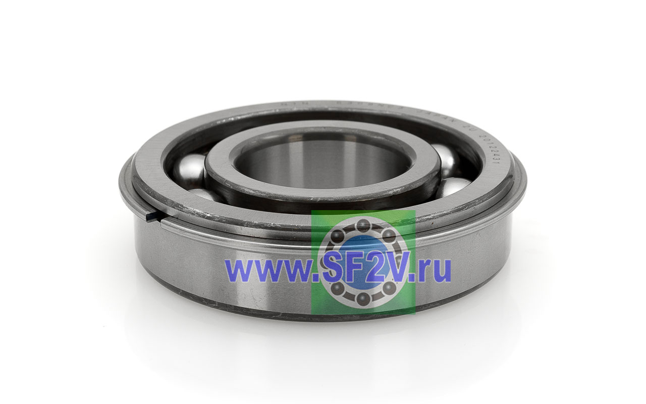 Шариковый подшипник, с канавкой и стопорным кольцом в сборе NR, однорядный радиальный открытый, c представляет собой шарикоподшипник с одним рядом шариков, предназначенный в основном для восприятия радиальных нагрузок и небольших осевых нагрузок в обоих направлениях. С канавкой и стопорным кольцом в сборе NR. При такой конструкции, подшипник сразу готов к фиксации в корпусе, стопорное кольцо жёстко ограничивает его осевое перемещение по наружному диаметру, применяется, когда установка не предусматривает фланец на корпусе или опорную гайку на валу, а осевая фиксация нужна именно по наружной обойме. Без стопорного кольца можно устанавливать, как обычный подшипник, канавка никак не влияет на работу подшипника. Внутреннее и наружное кольца имеют глубокие дорожки качения, а сепаратор удерживает шарики на равных расстояниях друг от друга. Открытость конструкции означает отсутствие уплотнений и защитных шайб, что обеспечивает низкое трение и простоту смазывания, но требует более тщательной защиты от загрязнений, может работать в масляной ванне. Такие подшипники применяются в электродвигателях, вентиляторах, редукторах и других узлах, где важны высокие скорости вращения и минимальные потери на трение.