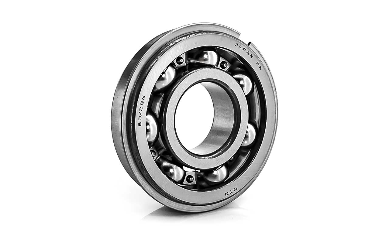 Шариковый подшипник, с канавкой и стопорным кольцом в сборе NR, однорядный радиальный открытый, c представляет собой шарикоподшипник с одним рядом шариков, предназначенный в основном для восприятия радиальных нагрузок и небольших осевых нагрузок в обоих направлениях. С канавкой и стопорным кольцом в сборе NR. При такой конструкции, подшипник сразу готов к фиксации в корпусе, стопорное кольцо жёстко ограничивает его осевое перемещение по наружному диаметру, применяется, когда установка не предусматривает фланец на корпусе или опорную гайку на валу, а осевая фиксация нужна именно по наружной обойме. Без стопорного кольца можно устанавливать, как обычный подшипник, канавка никак не влияет на работу подшипника. Внутреннее и наружное кольца имеют глубокие дорожки качения, а сепаратор удерживает шарики на равных расстояниях друг от друга. Открытость конструкции означает отсутствие уплотнений и защитных шайб, что обеспечивает низкое трение и простоту смазывания, но требует более тщательной защиты от загрязнений, может работать в масляной ванне. Такие подшипники применяются в электродвигателях, вентиляторах, редукторах и других узлах, где важны высокие скорости вращения и минимальные потери на трение.