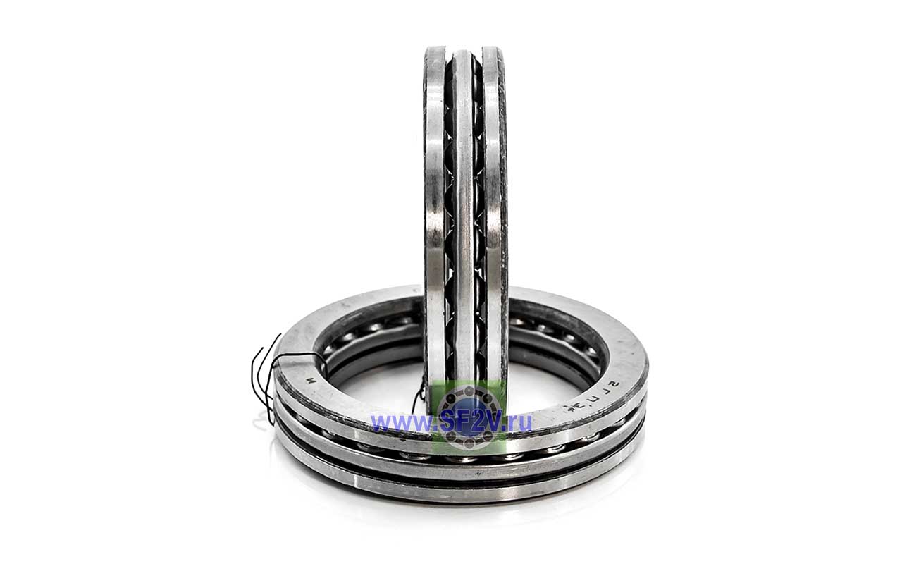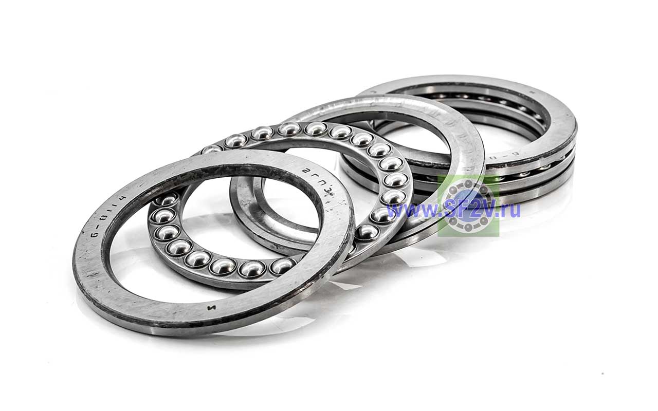 Упорный шарикоподшипник одинарный разборный. Воспринимают только осевые нагрузки и жестко фиксируют положение вала. Применимы для опор тихоходных валов, задвижек, крюков мостовых кранов, поворотных и нажимных устройств и т.д.