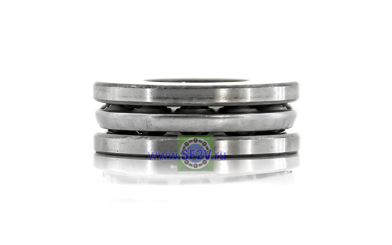 Упорный шарикоподшипник одинарный разборный. Воспринимают только осевые нагрузки и жестко фиксируют положение вала. Применимы для опор тихоходных валов, задвижек, крюков мостовых кранов, поворотных и нажимных устройств и т.д.