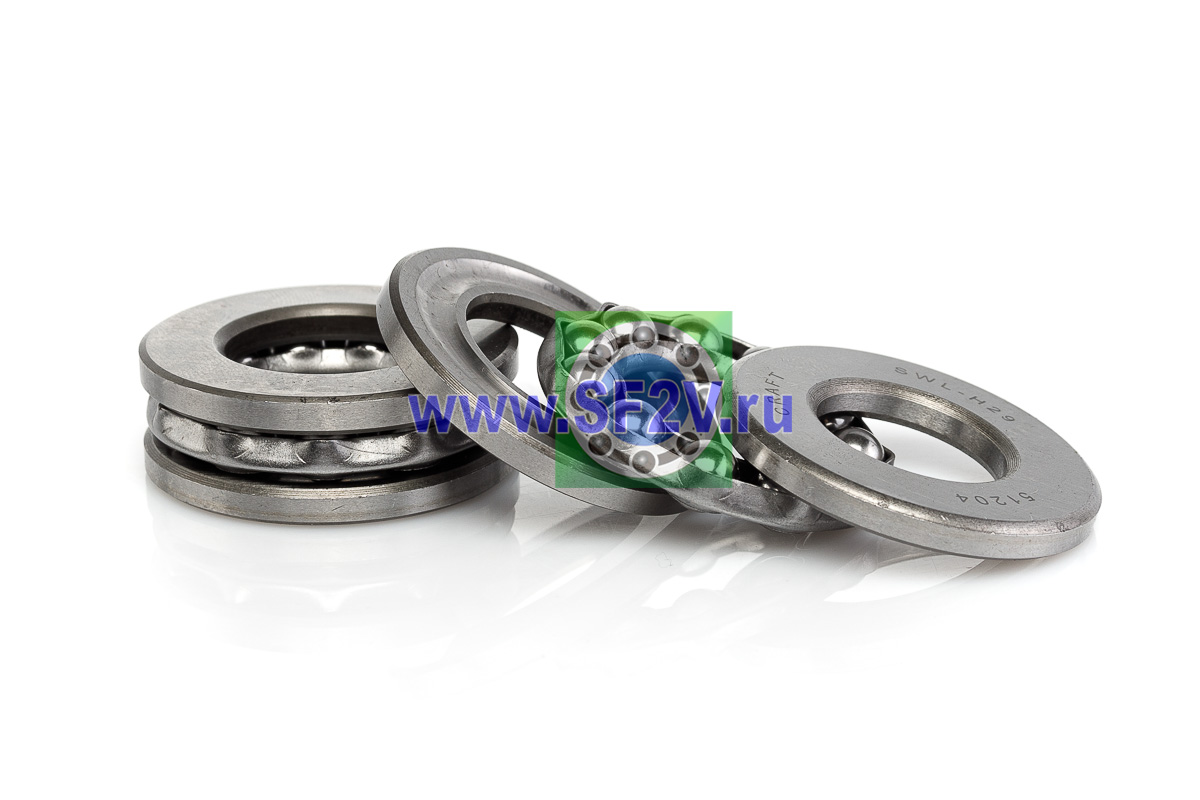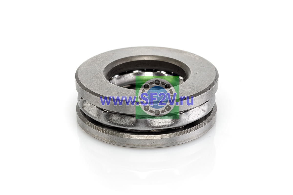 Упорный шарикоподшипник одинарный разборный. Воспринимают только осевые нагрузки и жестко фиксируют положение вала. Применимы для опор тихоходных валов, задвижек, крюков мостовых кранов, поворотных и нажимных устройств и т.д.