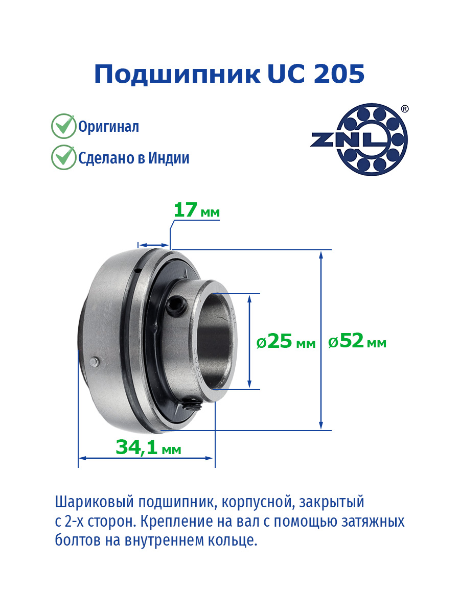 РАЗМЕРЫ И ХАРАКТЕРИСТИКИ Подшипник UC 205 ZNL