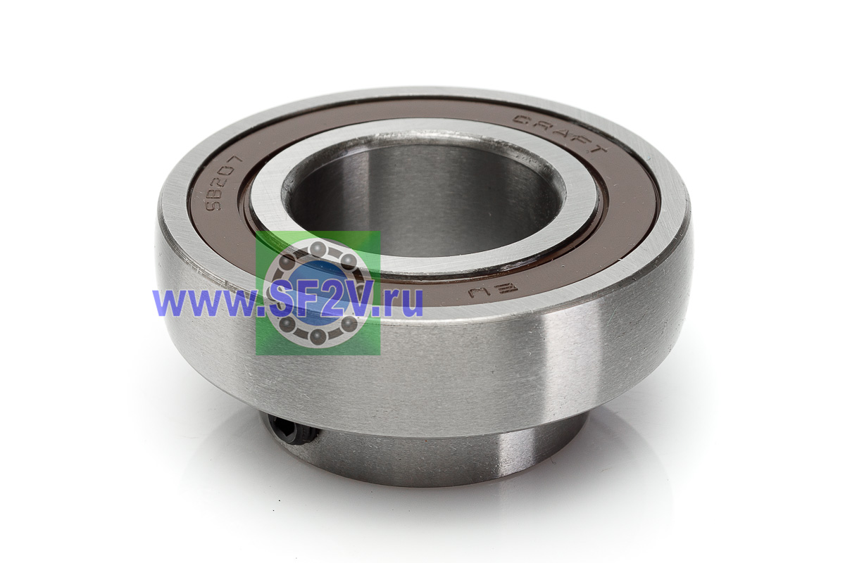 Шариковый подшипник, корпусной, закрытый с 2-х сторон. Крепление на вал с помощью затяжных болтов на внутреннем кольце. Подшипник типа UC – это корпусный подшипник, который используется для установки в корпусные подшипниковые узлы всех типов. Подшипник имеет сферическую наружную обойму, а корпус - сферическое посадочное отверстие. Такая конструкция позволяет подшипнику слегка перемещаться в корпусе, за счет чего компенсируется перекос вала или неточность монтажа. Крепление подшипника на валу осуществляется при помощи стопорных винтов. Кроме того, у такого подшипника есть специальные отверстия для замены смазки. Подшипники типа UC применяются в основном в качестве опор коротких валов, а также для тех мест установки, где возможно лишь небольшое тепловое линейное расширение. Осевые зазоры подшипника компенсируют небольшие удлинения вала. Подшипники типа UC применяются при нормальных нагрузках, низких или средних скоростях вращения.