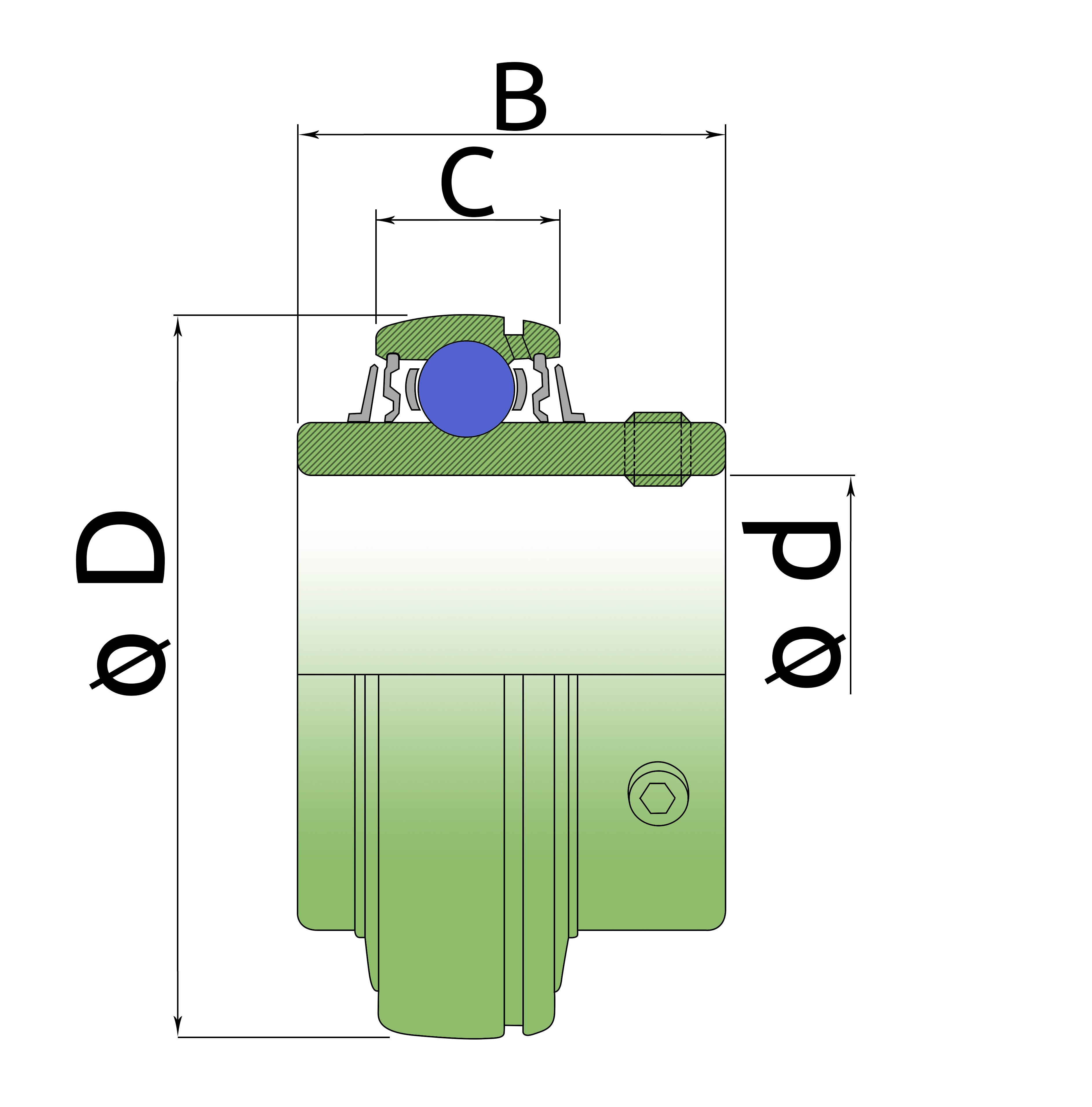 Шариковый подшипник, корпусной, закрытый с 2-х сторон. Крепление на вал с помощью затяжных болтов на внутреннем кольце. Подшипник типа UC – это корпусный подшипник, который используется для установки в корпусные подшипниковые узлы всех типов. Подшипник имеет сферическую наружную обойму, а корпус - сферическое посадочное отверстие. Такая конструкция позволяет подшипнику слегка перемещаться в корпусе, за счет чего компенсируется перекос вала или неточность монтажа. Крепление подшипника на валу осуществляется при помощи стопорных винтов. Кроме того, у такого подшипника есть специальные отверстия для замены смазки. Подшипники типа UC применяются в основном в качестве опор коротких валов, а также для тех мест установки, где возможно лишь небольшое тепловое линейное расширение. Осевые зазоры подшипника компенсируют небольшие удлинения вала. Подшипники типа UC применяются при нормальных нагрузках, низких или средних скоростях вращения.