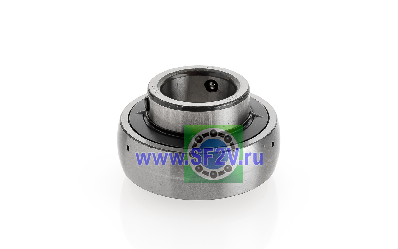 Шариковый подшипник, корпусной, закрытый с 2-х сторон. Крепление на вал с помощью затяжных болтов на внутреннем кольце. Подшипник типа UC – это корпусный подшипник, который используется для установки в корпусные подшипниковые узлы всех типов. Подшипник имеет сферическую наружную обойму, а корпус - сферическое посадочное отверстие. Такая конструкция позволяет подшипнику слегка перемещаться в корпусе, за счет чего компенсируется перекос вала или неточность монтажа. Крепление подшипника на валу осуществляется при помощи стопорных винтов. Кроме того, у такого подшипника есть специальные отверстия для замены смазки. Подшипники типа UC применяются в основном в качестве опор коротких валов, а также для тех мест установки, где возможно лишь небольшое тепловое линейное расширение. Осевые зазоры подшипника компенсируют небольшие удлинения вала. Подшипники типа UC применяются при нормальных нагрузках, низких или средних скоростях вращения.