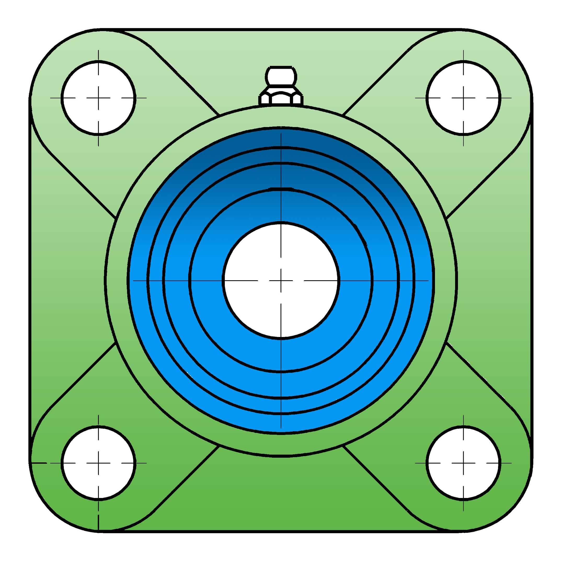 UCF - Подшипник с корпусом в сборе. Подшипник типа UC и подшипниковый корпус типа F - не разъемный, стационарный, фланец квадратного сечения, с четырьмя отверстиями для крепежных болтов, выполненный из литого чугуна, снабжен ниппелем для проведения сервисных работ по замене смазки.