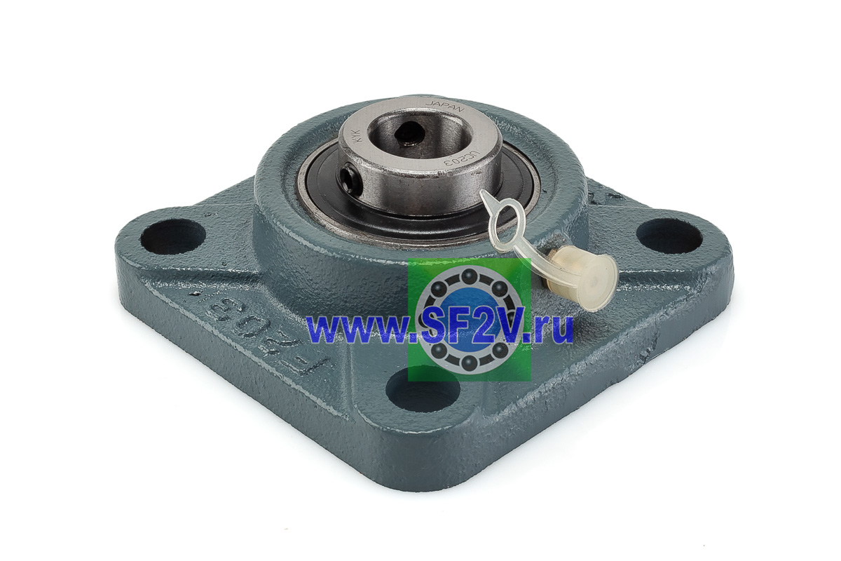 UCF - Подшипник с корпусом в сборе. Подшипник типа UC и подшипниковый корпус типа F - не разъемный, стационарный, фланец квадратного сечения, с четырьмя отверстиями для крепежных болтов, выполненный из литого чугуна, снабжен ниппелем для проведения сервисных работ по замене смазки.
