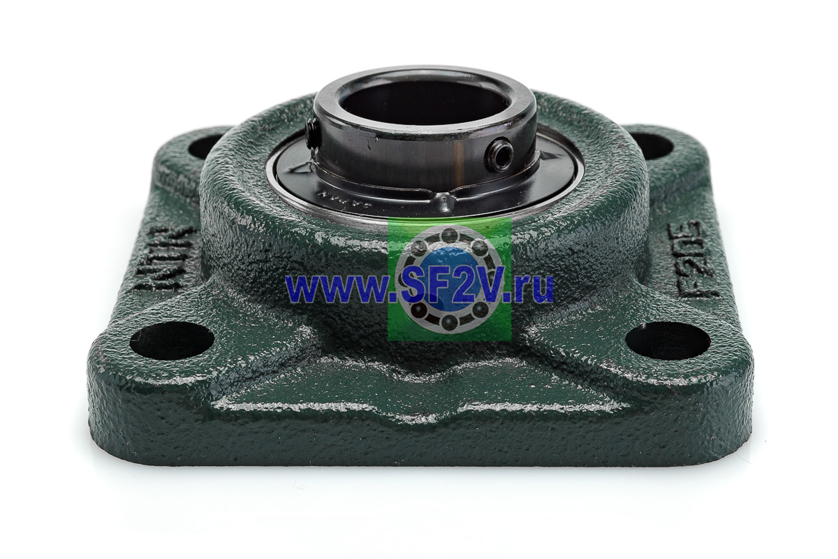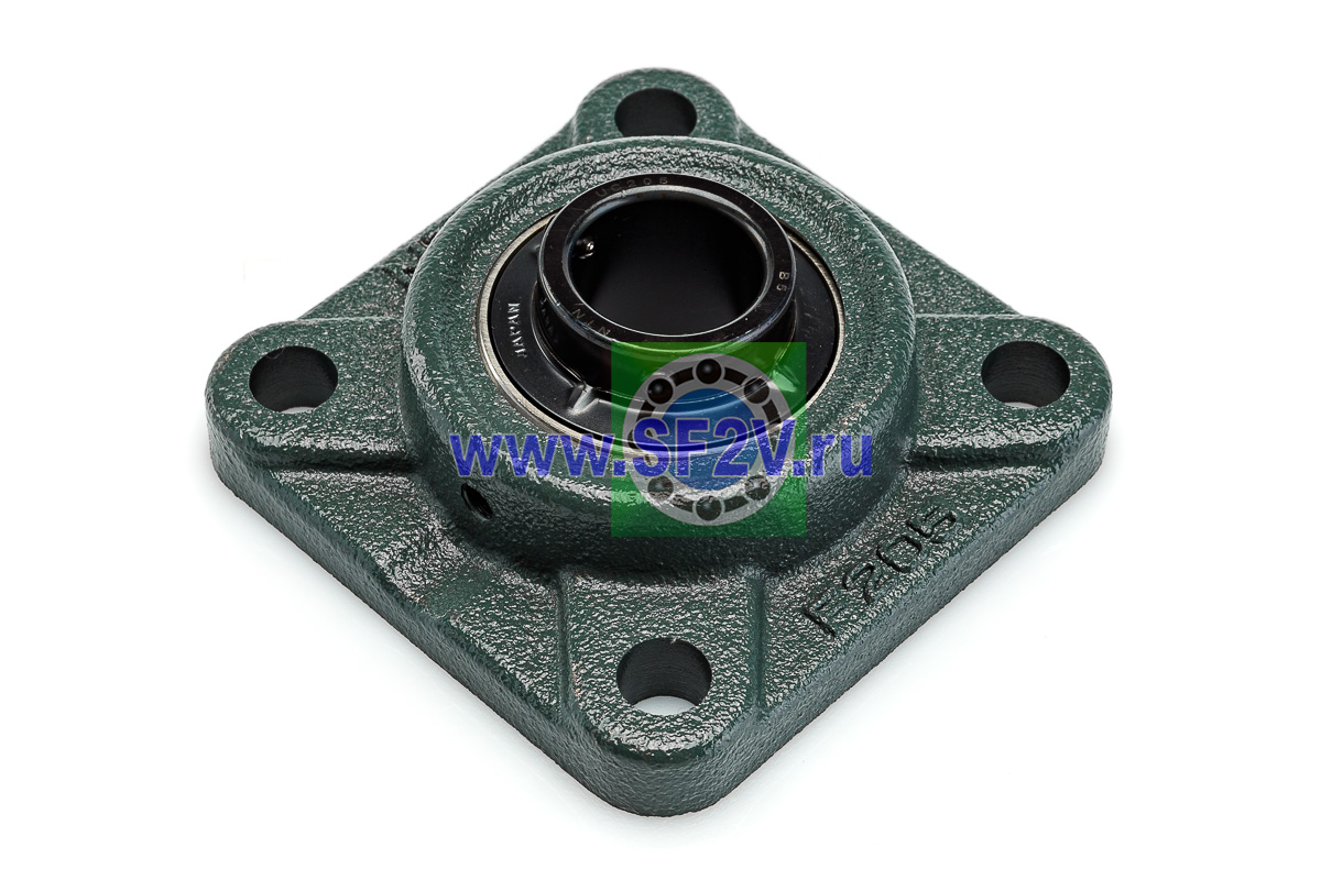 UCF - Подшипник с корпусом в сборе. Подшипник типа UC и подшипниковый корпус типа F - не разъемный, стационарный, фланец квадратного сечения, с четырьмя отверстиями для крепежных болтов, выполненный из литого чугуна, снабжен ниппелем для проведения сервисных работ по замене смазки.