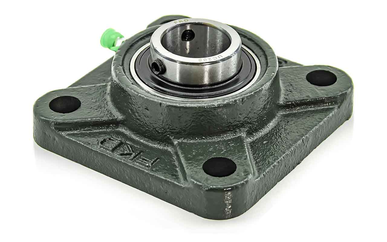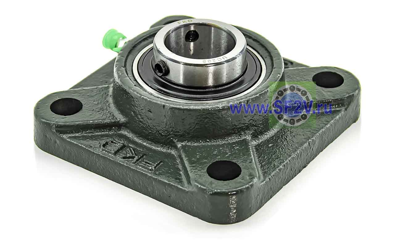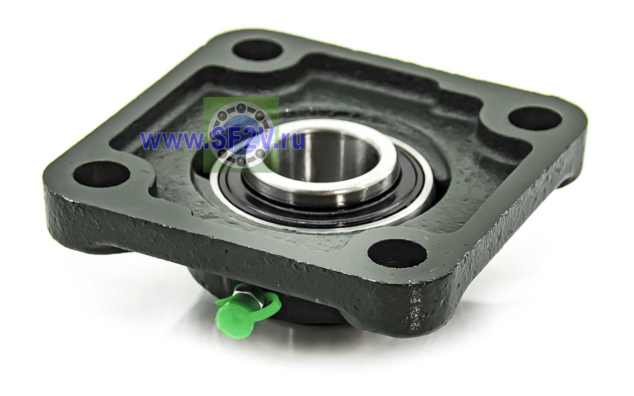 UCF - Подшипник с корпусом в сборе. Подшипник типа UC и подшипниковый корпус типа F - не разъемный, стационарный, фланец квадратного сечения, с четырьмя отверстиями для крепежных болтов, выполненный из литого чугуна, снабжен ниппелем для проведения сервисных работ по замене смазки.