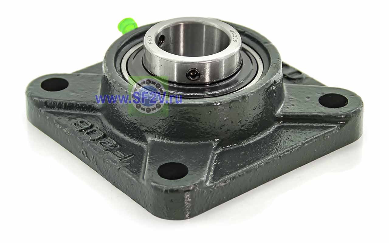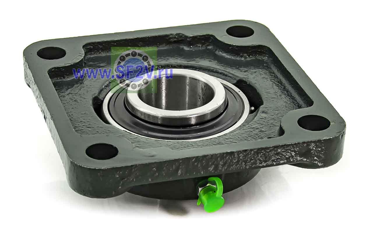 UCF - Подшипник с корпусом в сборе. Подшипник типа UC и подшипниковый корпус типа F - не разъемный, стационарный, фланец квадратного сечения, с четырьмя отверстиями для крепежных болтов, выполненный из литого чугуна, снабжен ниппелем для проведения сервисных работ по замене смазки.