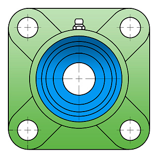 UCF - Подшипник с корпусом в сборе. Подшипник типа UC и подшипниковый корпус типа F - не разъемный, стационарный, фланец квадратного сечения, с четырьмя отверстиями для крепежных болтов, выполненный из литого чугуна, снабжен ниппелем для проведения сервисных работ по замене смазки.