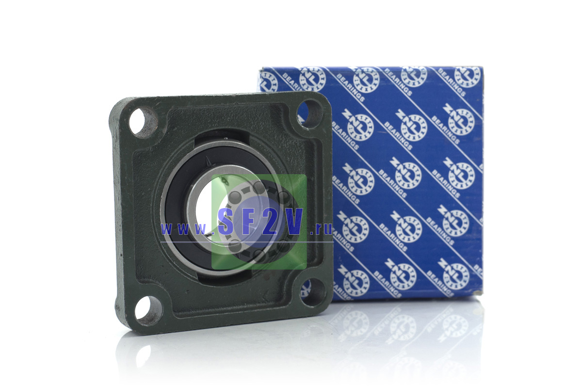 UCF - Подшипник с корпусом в сборе. Подшипник типа UC и подшипниковый корпус типа F - не разъемный, стационарный, фланец квадратного сечения, с четырьмя отверстиями для крепежных болтов, выполненный из литого чугуна, снабжен ниппелем для проведения сервисных работ по замене смазки.