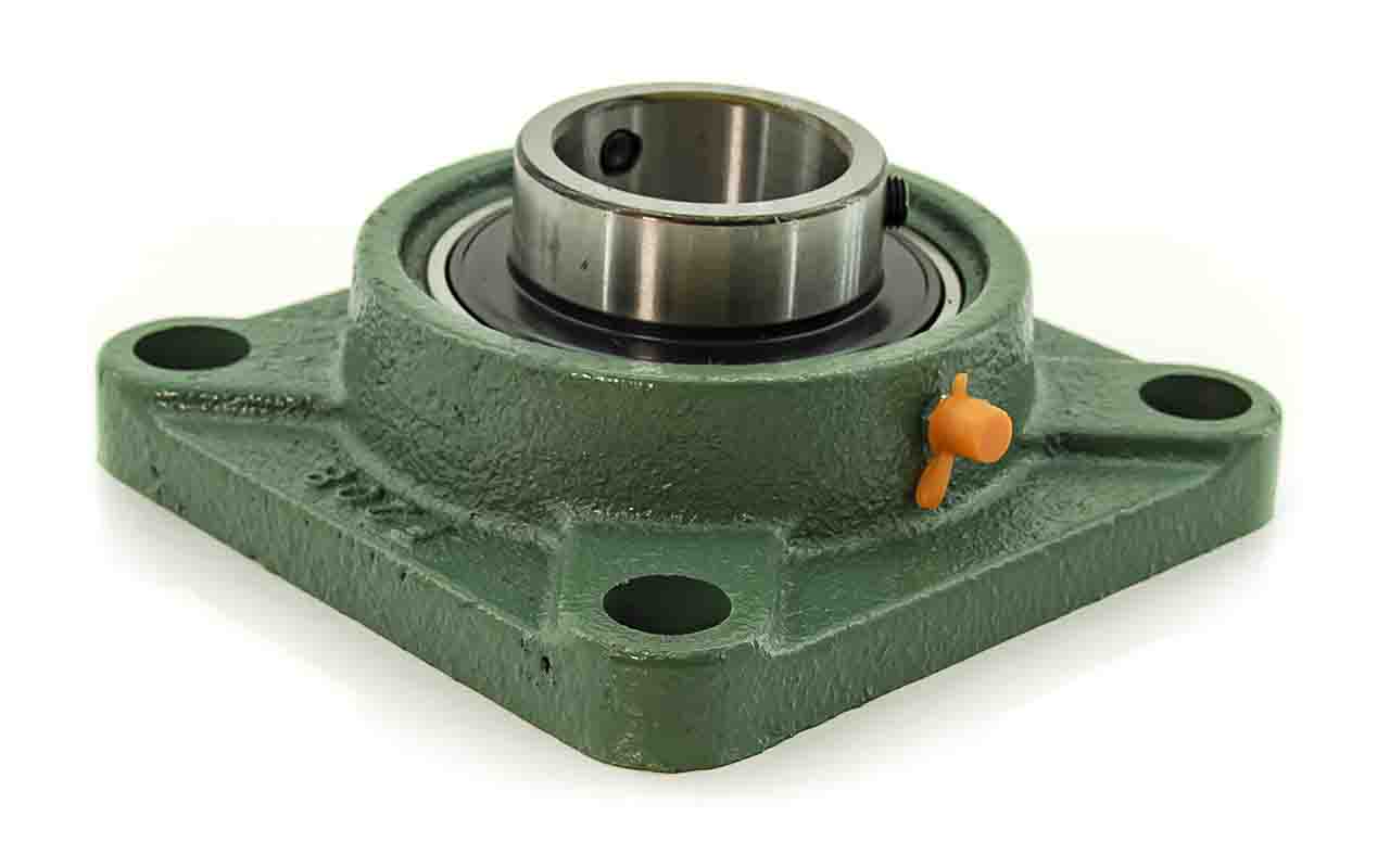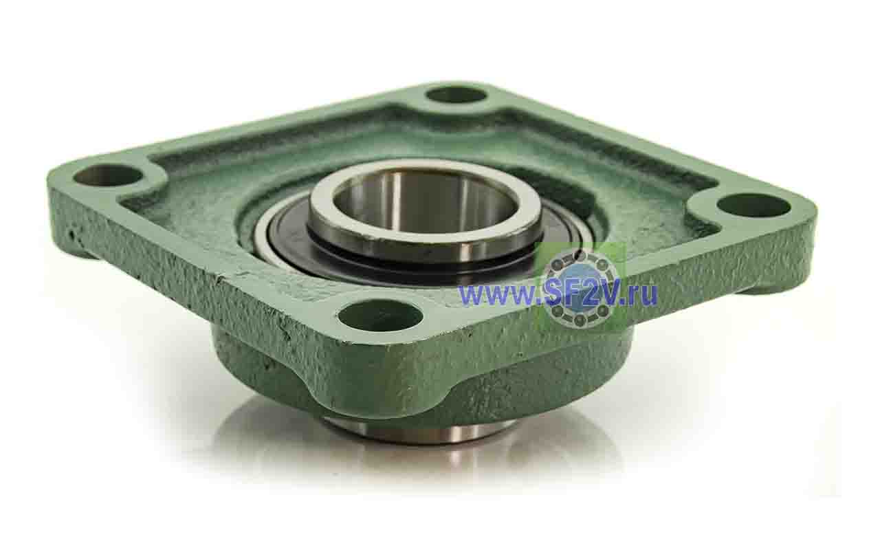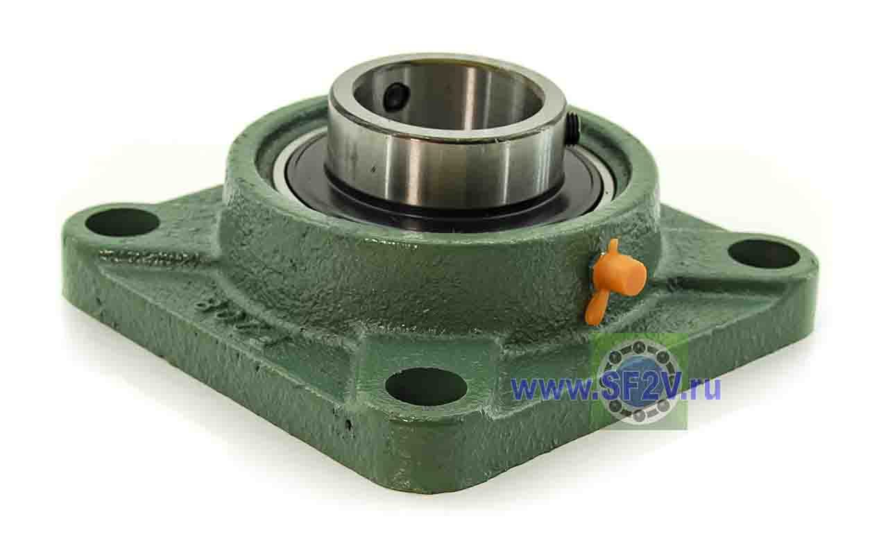 UCF - Подшипник с корпусом в сборе. Подшипник типа UC и подшипниковый корпус типа F - не разъемный, стационарный, фланец квадратного сечения, с четырьмя отверстиями для крепежных болтов, выполненный из литого чугуна, снабжен ниппелем для проведения сервисных работ по замене смазки.
