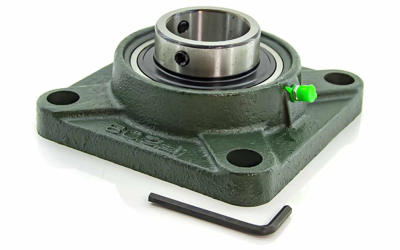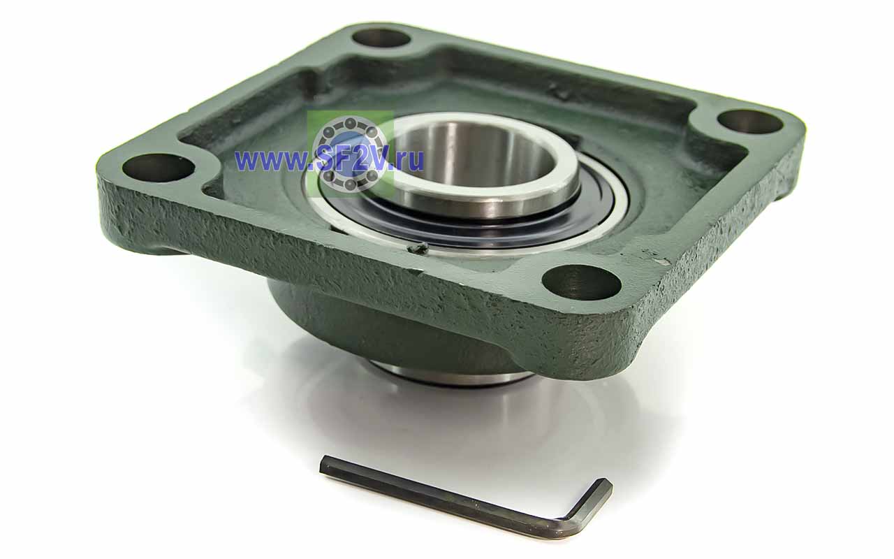 UCF - Подшипник с корпусом в сборе. Подшипник типа UC и подшипниковый корпус типа F - не разъемный, стационарный, фланец квадратного сечения, с четырьмя отверстиями для крепежных болтов, выполненный из литого чугуна, снабжен ниппелем для проведения сервисных работ по замене смазки.