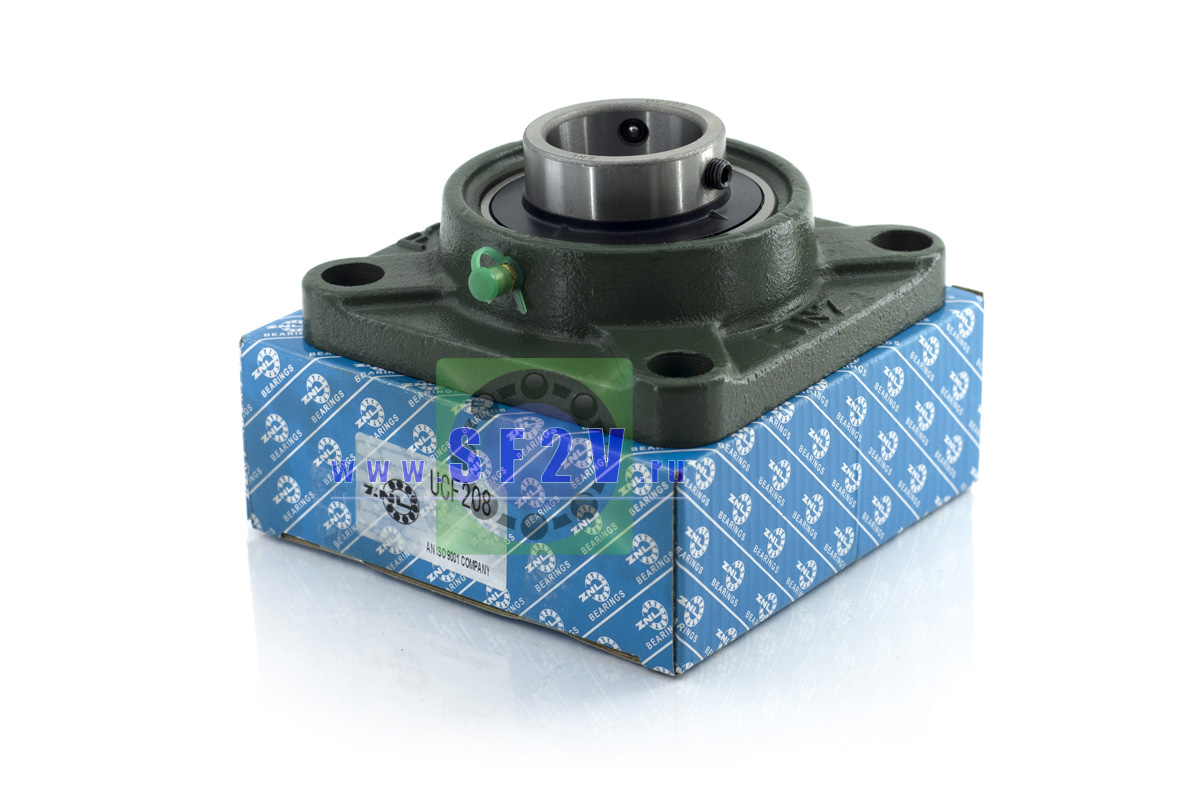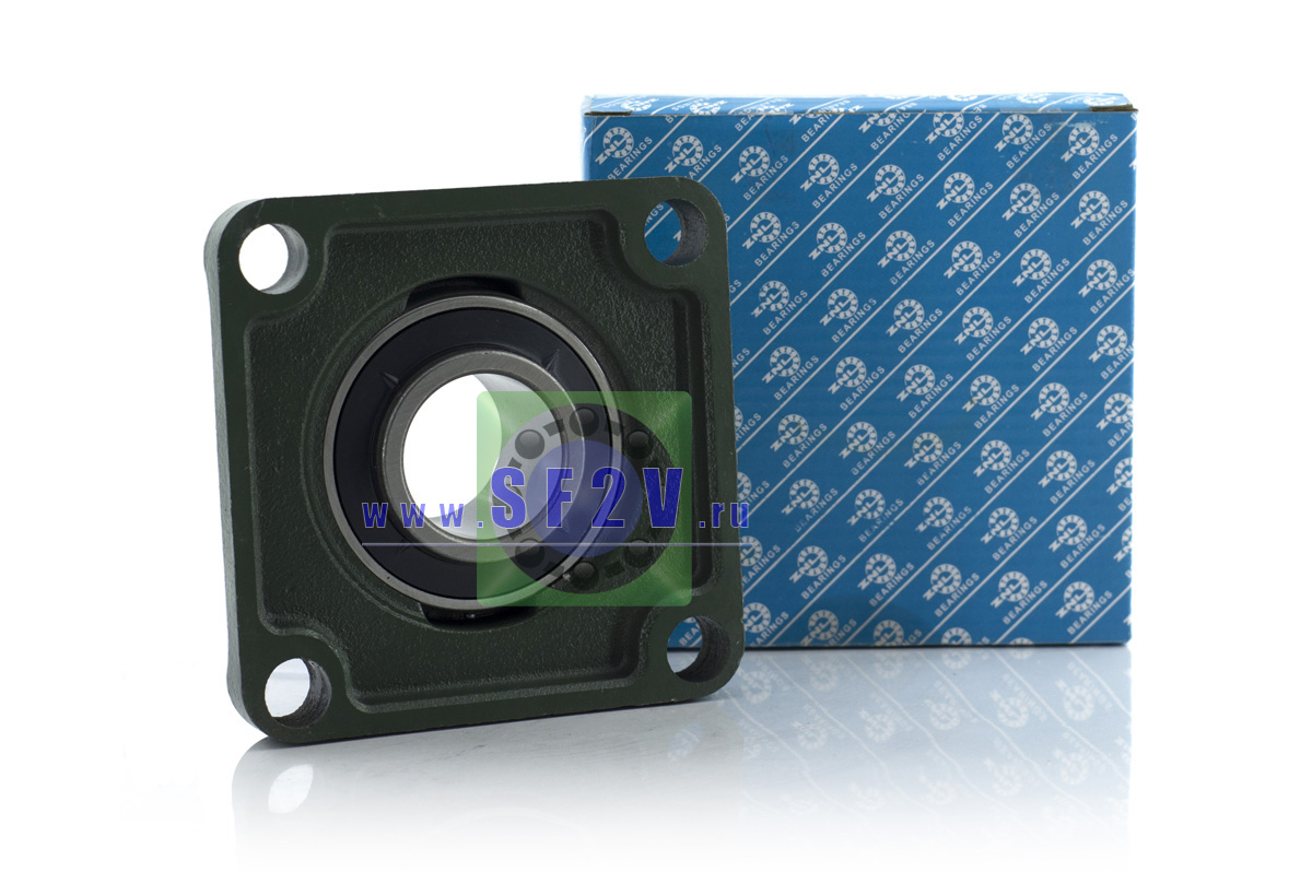 UCF - Подшипник с корпусом в сборе. Подшипник типа UC и подшипниковый корпус типа F - не разъемный, стационарный, фланец квадратного сечения, с четырьмя отверстиями для крепежных болтов, выполненный из литого чугуна, снабжен ниппелем для проведения сервисных работ по замене смазки.