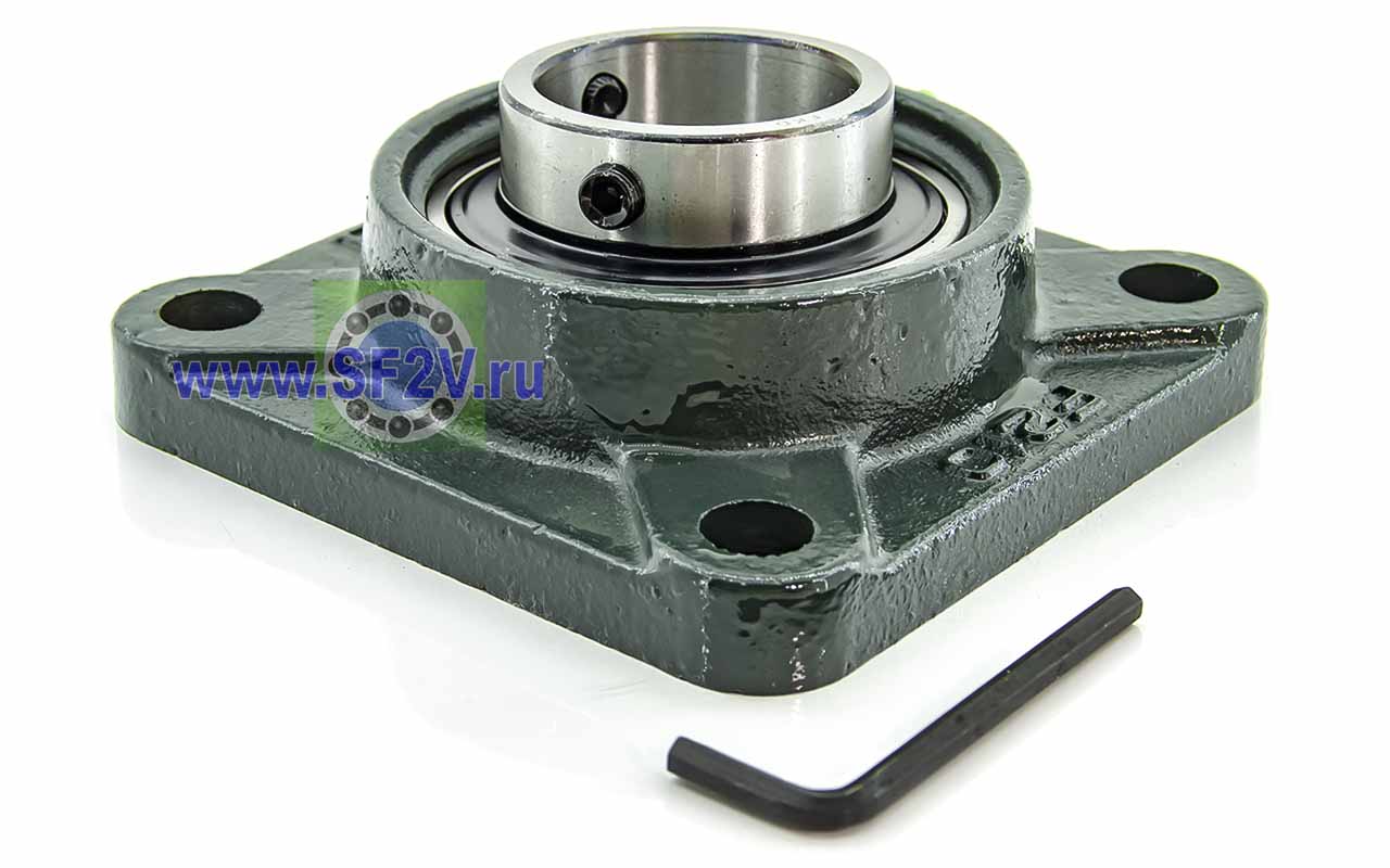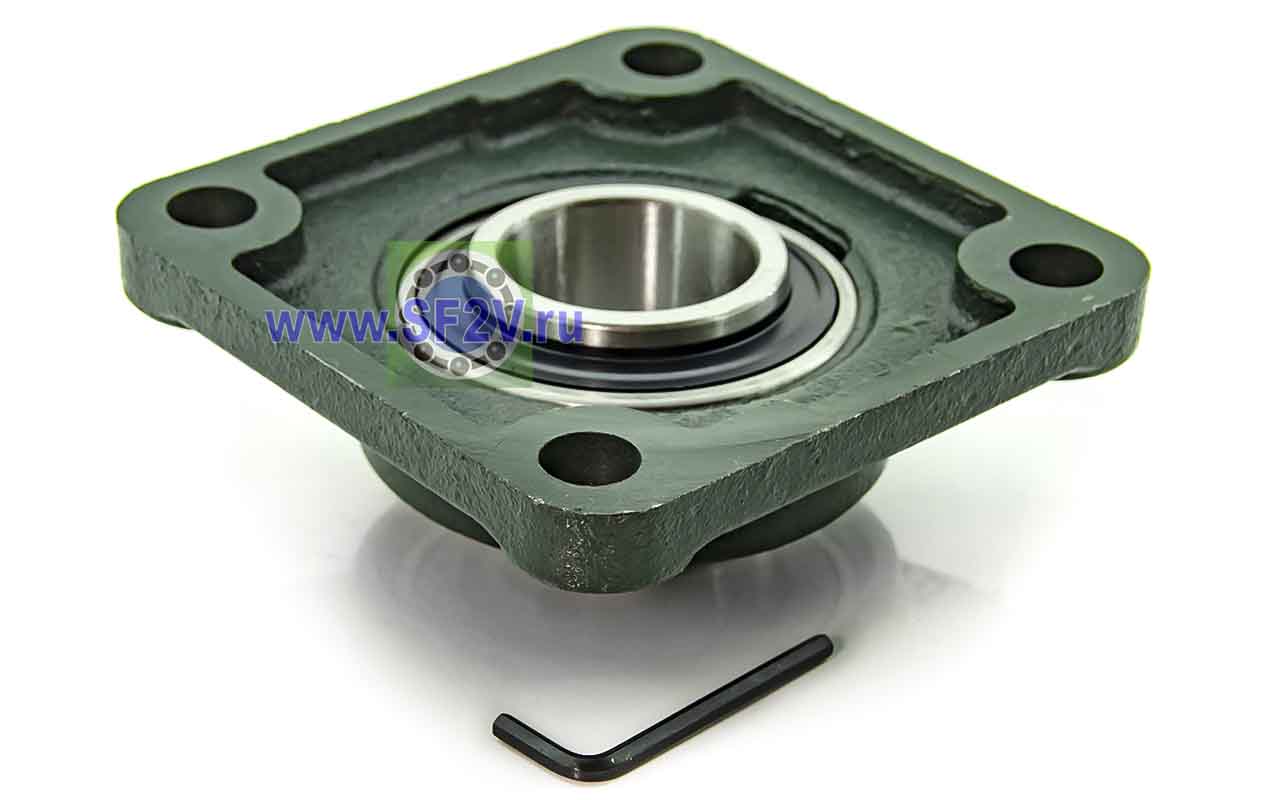 UCF - Подшипник с корпусом в сборе. Подшипник типа UC и подшипниковый корпус типа F - не разъемный, стационарный, фланец квадратного сечения, с четырьмя отверстиями для крепежных болтов, выполненный из литого чугуна, снабжен ниппелем для проведения сервисных работ по замене смазки.