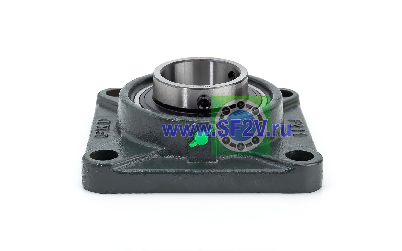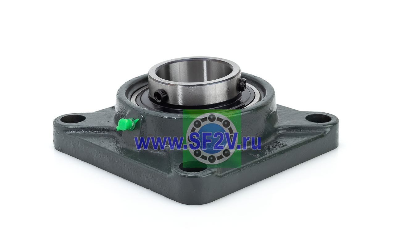 UCF - Подшипник с корпусом в сборе. Подшипник типа UC и подшипниковый корпус типа F - не разъемный, стационарный, фланец квадратного сечения, с четырьмя отверстиями для крепежных болтов, выполненный из литого чугуна, снабжен ниппелем для проведения сервисных работ по замене смазки.