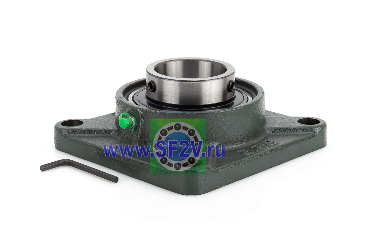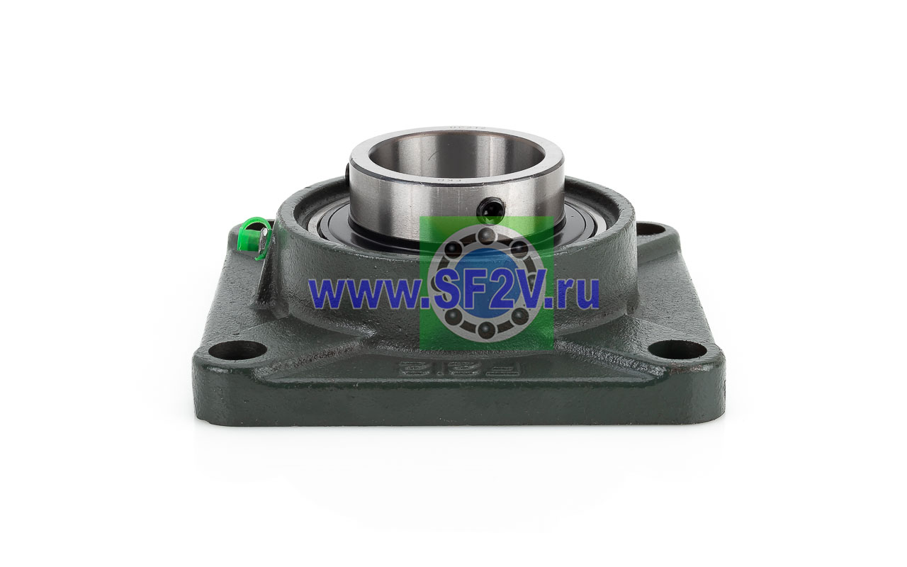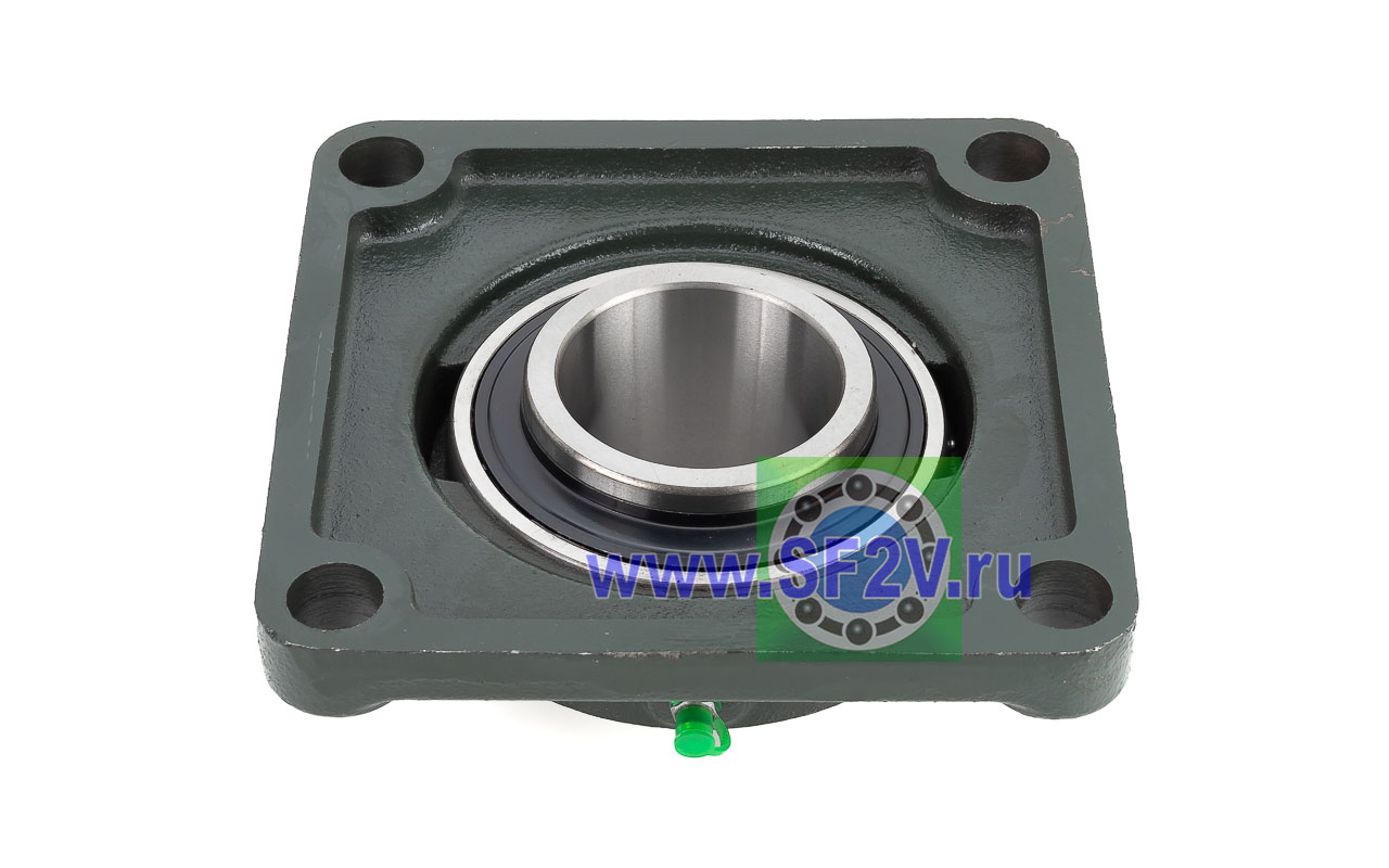 UCF - Подшипник с корпусом в сборе. Подшипник типа UC и подшипниковый корпус типа F - не разъемный, стационарный, фланец квадратного сечения, с четырьмя отверстиями для крепежных болтов, выполненный из литого чугуна, снабжен ниппелем для проведения сервисных работ по замене смазки.