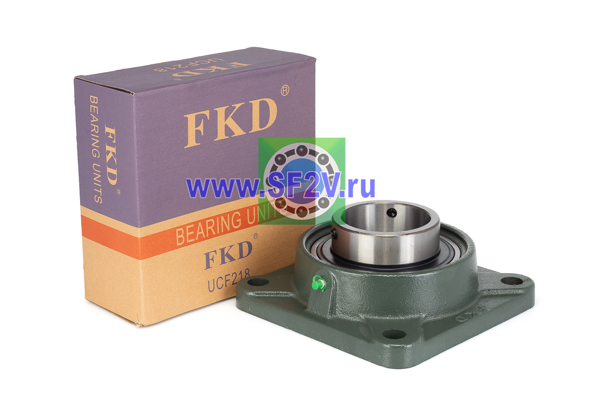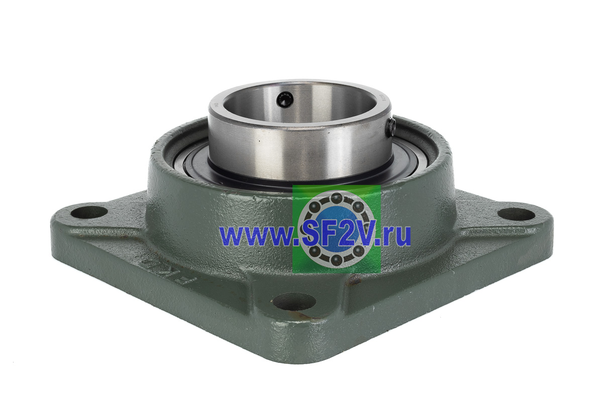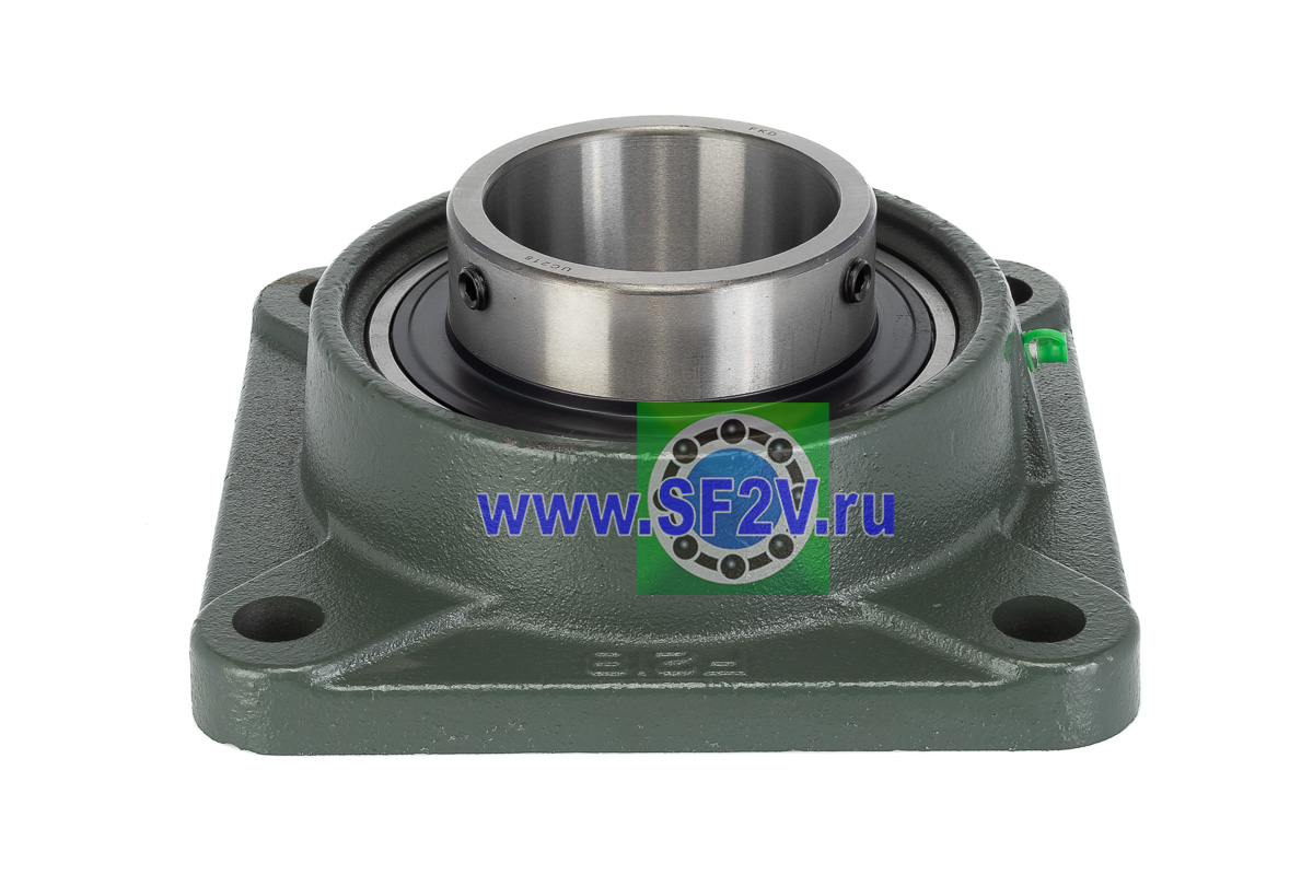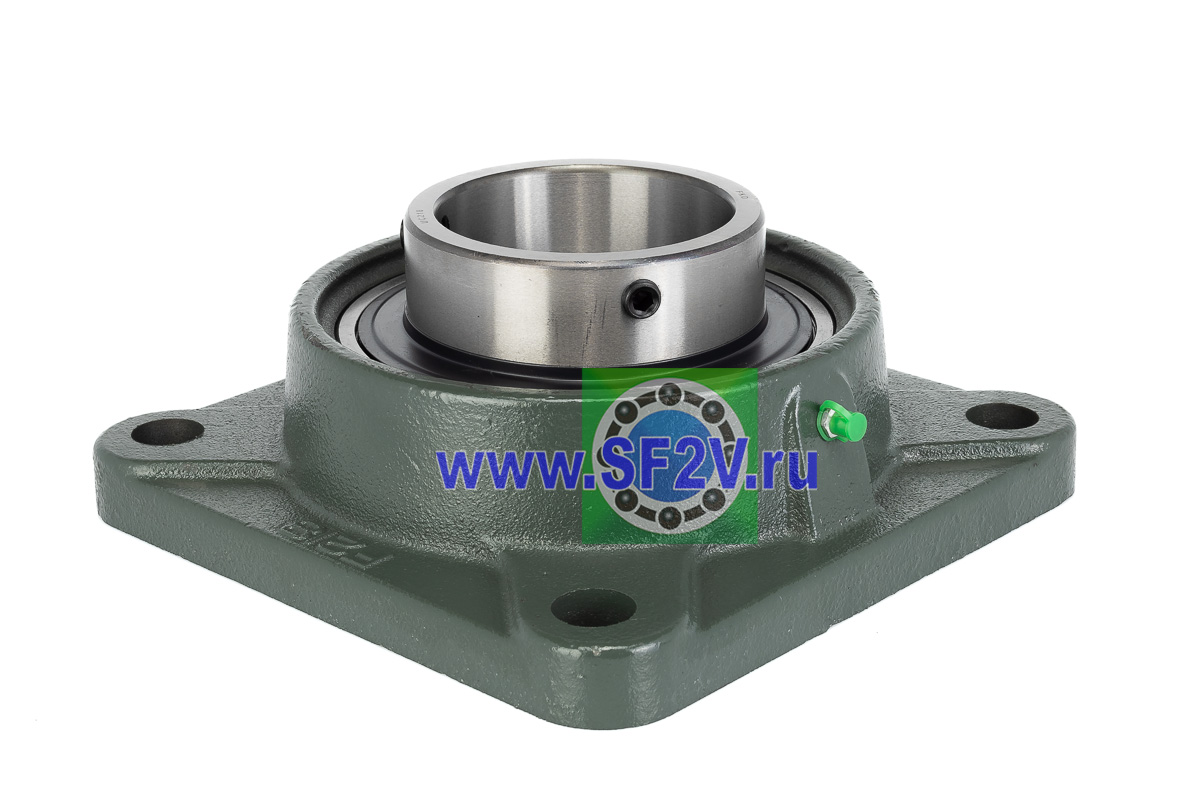 UCF - Подшипник с корпусом в сборе. Подшипник типа UC и подшипниковый корпус типа F - не разъемный, стационарный, фланец квадратного сечения, с четырьмя отверстиями для крепежных болтов, выполненный из литого чугуна, снабжен ниппелем для проведения сервисных работ по замене смазки.