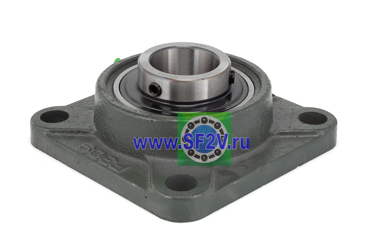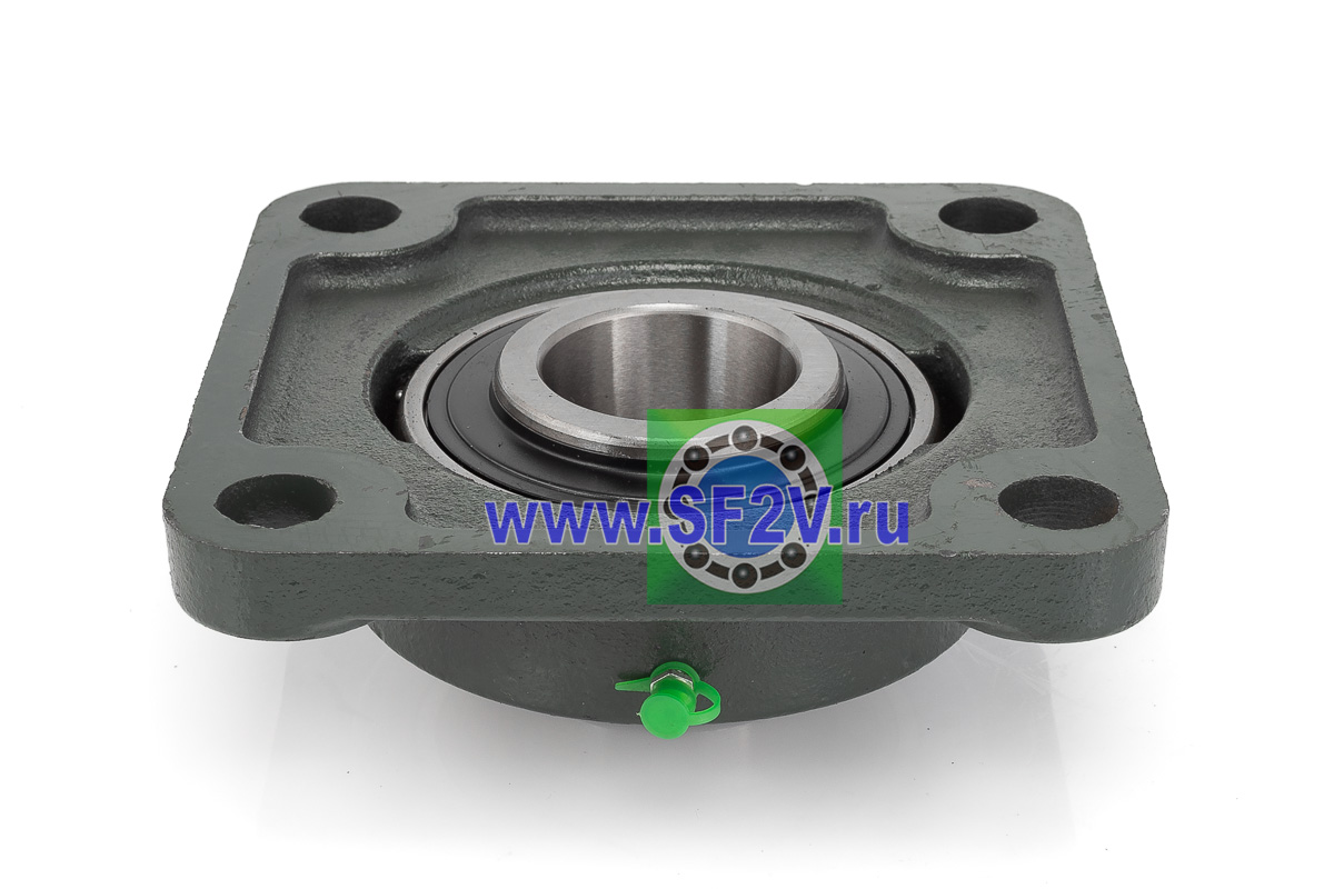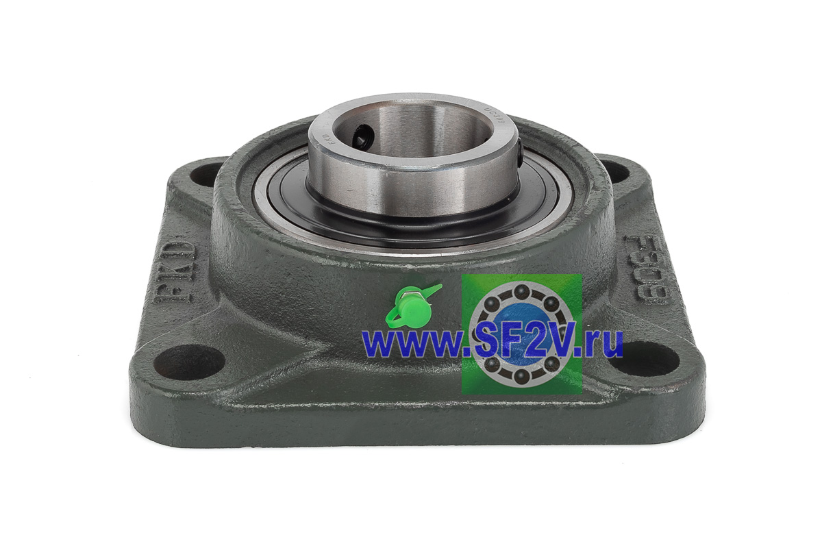 UCF - Подшипник с корпусом в сборе. Подшипник типа UC и подшипниковый корпус типа F - не разъемный, стационарный, фланец квадратного сечения, с четырьмя отверстиями для крепежных болтов, выполненный из литого чугуна, снабжен ниппелем для проведения сервисных работ по замене смазки.