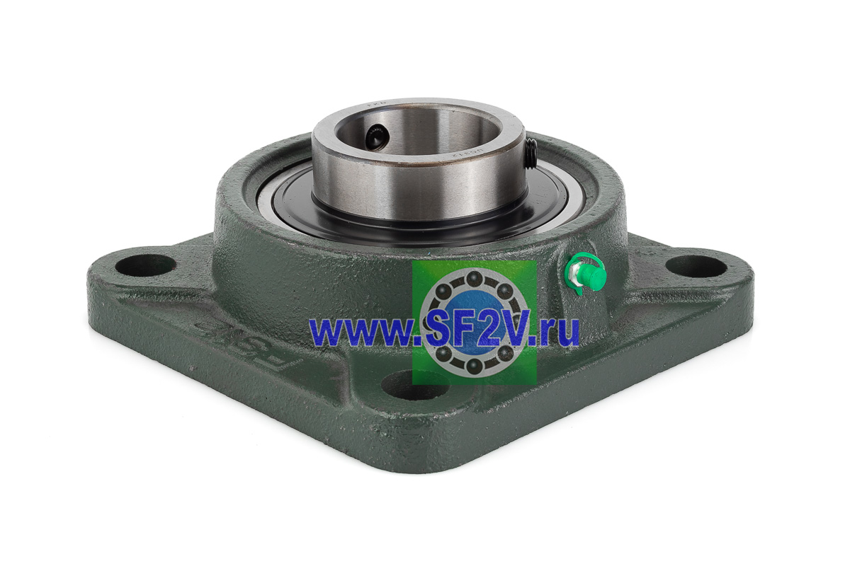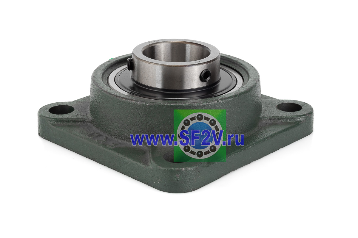 UCF - Подшипник с корпусом в сборе. Подшипник типа UC и подшипниковый корпус типа F - не разъемный, стационарный, фланец квадратного сечения, с четырьмя отверстиями для крепежных болтов, выполненный из литого чугуна, снабжен ниппелем для проведения сервисных работ по замене смазки.