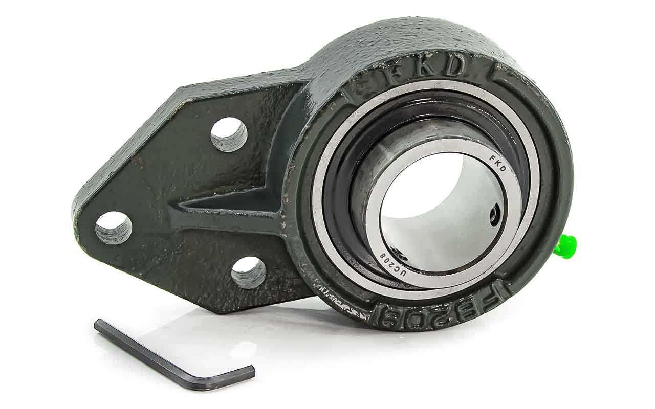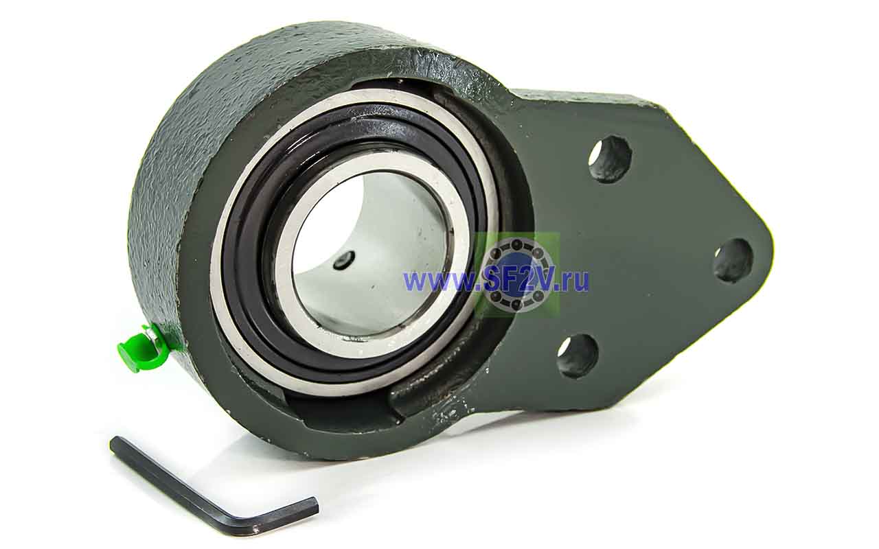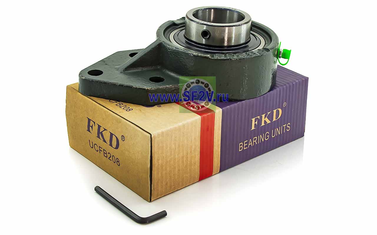 UCFB - Подшипник с корпусом в сборе. Подшипник типа UC и подшипниковый корпус типа FB - не разъемный, стационарный, фланец с тремя отверстиями для крепежных болтов, выполненный из литого чугуна, снабжен ниппелем для проведения сервисных работ по замене смазки.