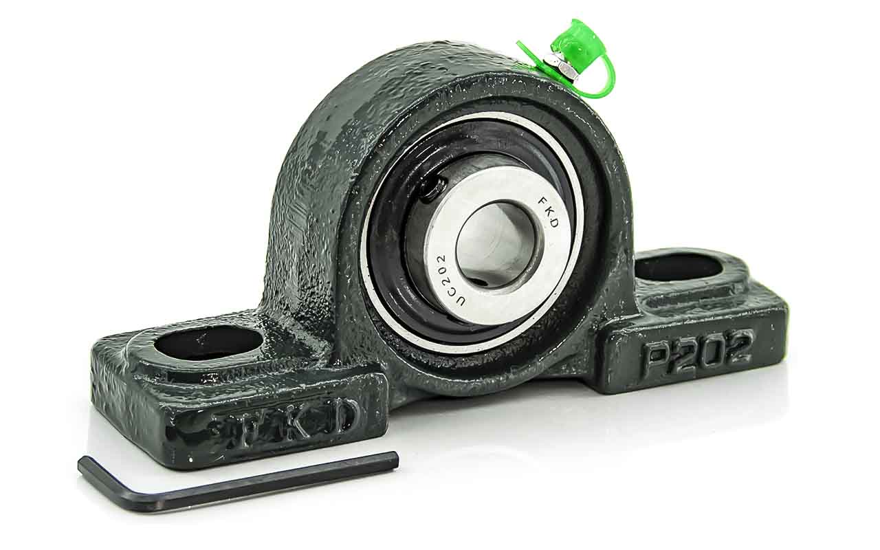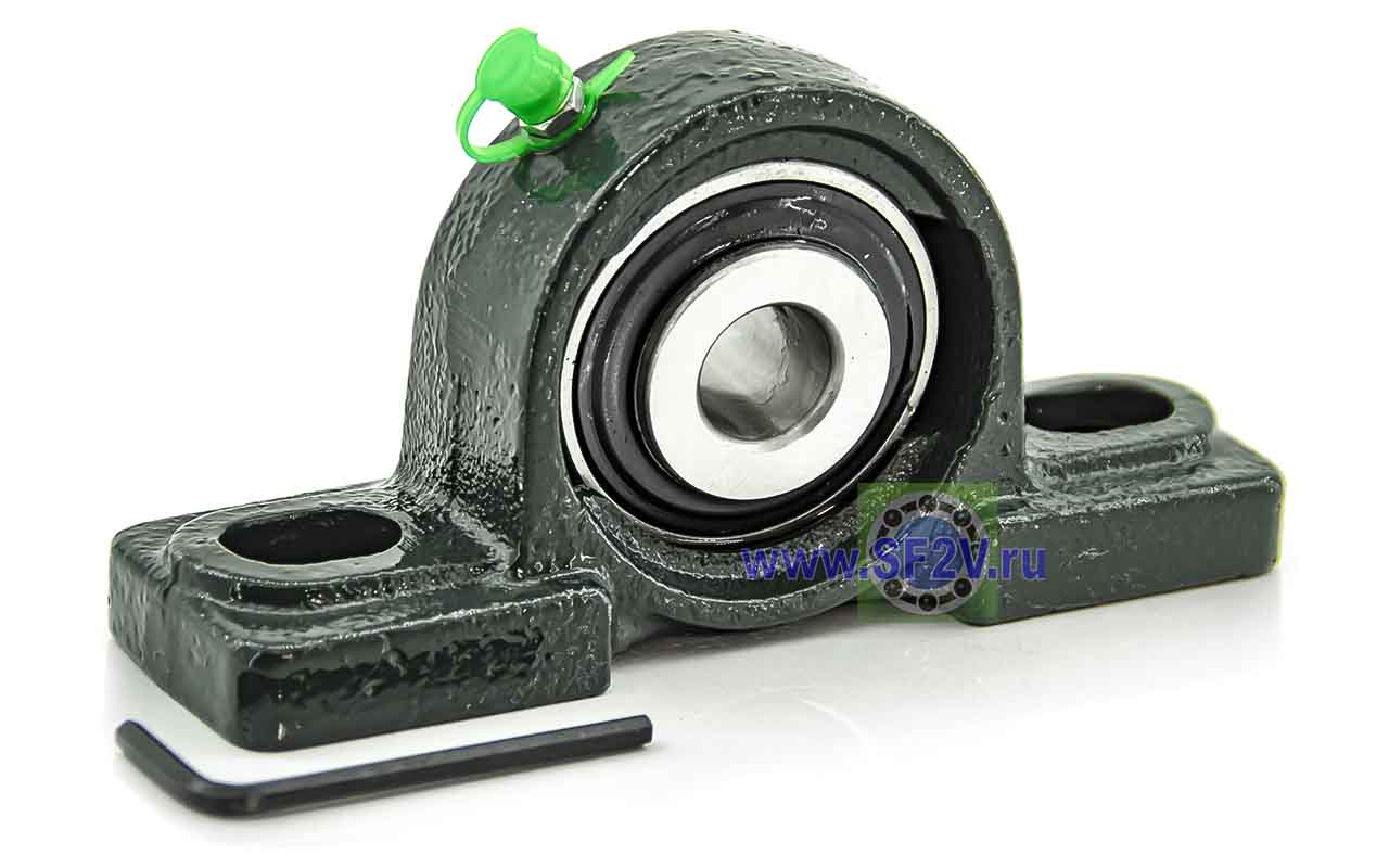 UCP - Подшипник с корпусом в сборе. Подшипник типа UC и подшипниковый корпус типа P - не разъемный, стационарный, фланцевый корпус с двумя отверстиями для крепежных болтов, выполненный из литого чугуна, снабжен ниппелем для проведения сервисных работ по замене смазки.