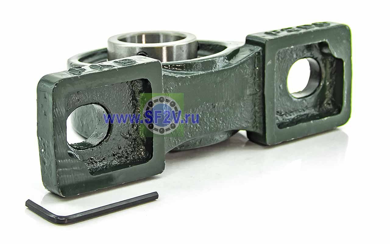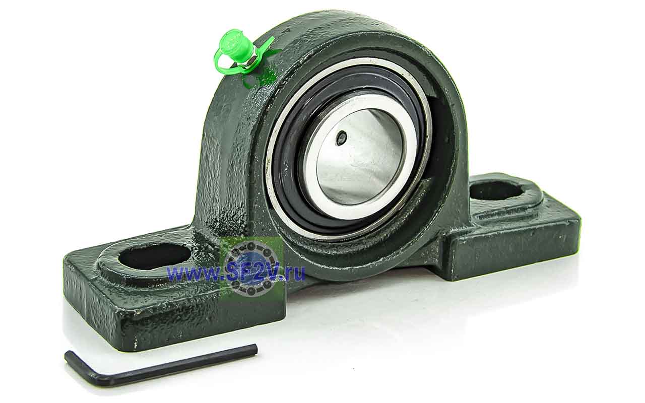 UCP - Подшипник с корпусом в сборе. Подшипник типа UC и подшипниковый корпус типа P - не разъемный, стационарный, фланцевый корпус с двумя отверстиями для крепежных болтов, выполненный из литого чугуна, снабжен ниппелем для проведения сервисных работ по замене смазки.
