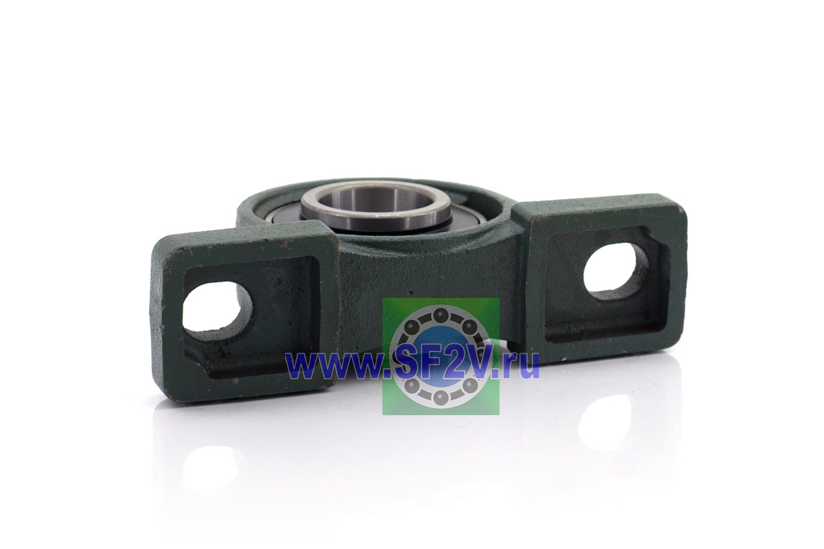 UCP - Подшипник с корпусом в сборе. Подшипник типа UC и подшипниковый корпус типа P - не разъемный, стационарный, фланцевый корпус с двумя отверстиями для крепежных болтов, выполненный из литого чугуна, снабжен ниппелем для проведения сервисных работ по замене смазки.