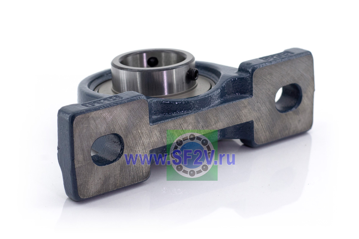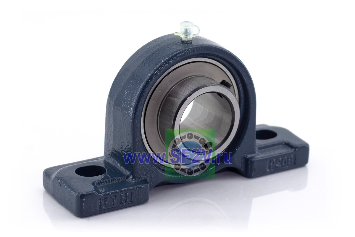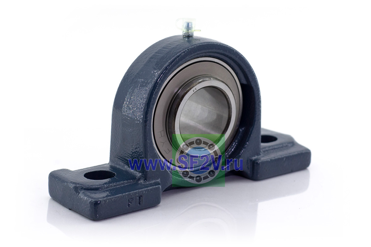 UCP - Подшипник с корпусом в сборе. Подшипник типа UC и подшипниковый корпус типа P - не разъемный, стационарный, фланцевый корпус с двумя отверстиями для крепежных болтов, выполненный из литого чугуна, снабжен ниппелем для проведения сервисных работ по замене смазки.