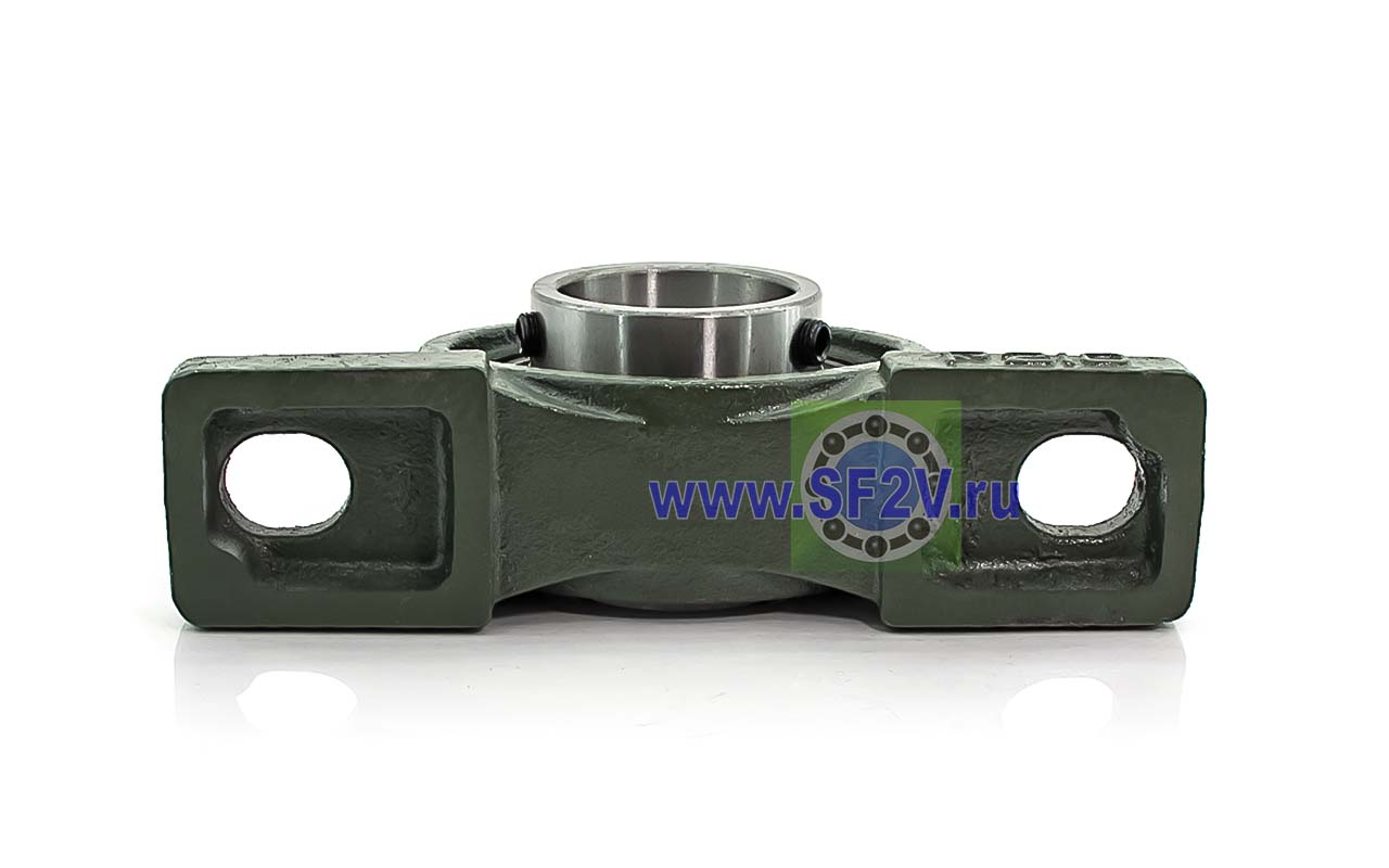 UCP - Подшипник с корпусом в сборе. Подшипник типа UC и подшипниковый корпус типа P - не разъемный, стационарный, фланцевый корпус с двумя отверстиями для крепежных болтов, выполненный из литого чугуна, снабжен ниппелем для проведения сервисных работ по замене смазки.