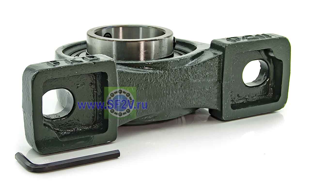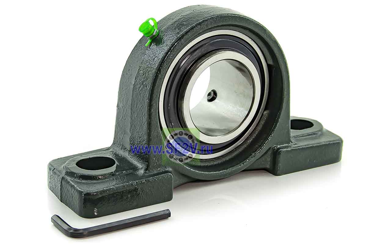 UCP - Подшипник с корпусом в сборе. Подшипник типа UC и подшипниковый корпус типа P - не разъемный, стационарный, фланцевый корпус с двумя отверстиями для крепежных болтов, выполненный из литого чугуна, снабжен ниппелем для проведения сервисных работ по замене смазки.
