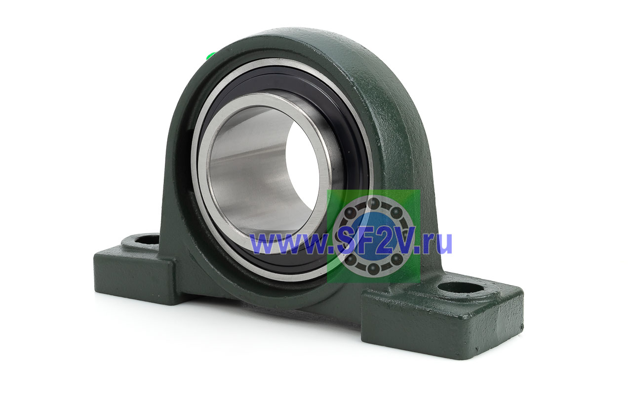 UCP - Подшипник с корпусом в сборе. Подшипник типа UC и подшипниковый корпус типа P - не разъемный, стационарный, фланцевый корпус с двумя отверстиями для крепежных болтов, выполненный из литого чугуна, снабжен ниппелем для проведения сервисных работ по замене смазки.