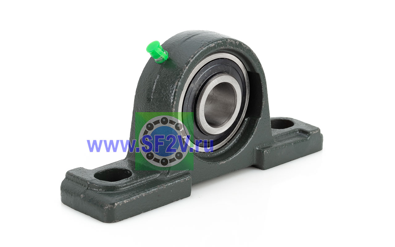 UCP - Подшипник с корпусом в сборе. Подшипник типа UC и подшипниковый корпус типа P - не разъемный, стационарный, фланцевый корпус с двумя отверстиями для крепежных болтов, выполненный из литого чугуна, снабжен ниппелем для проведения сервисных работ по замене смазки.