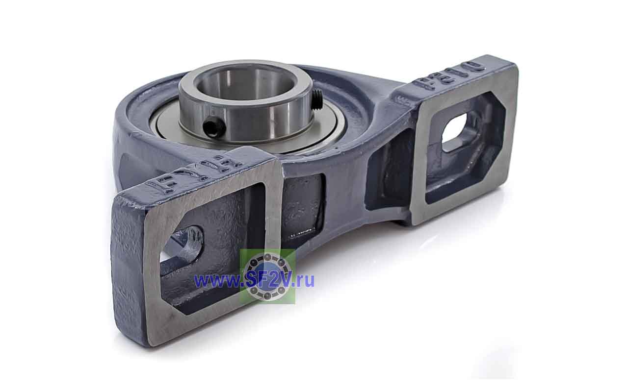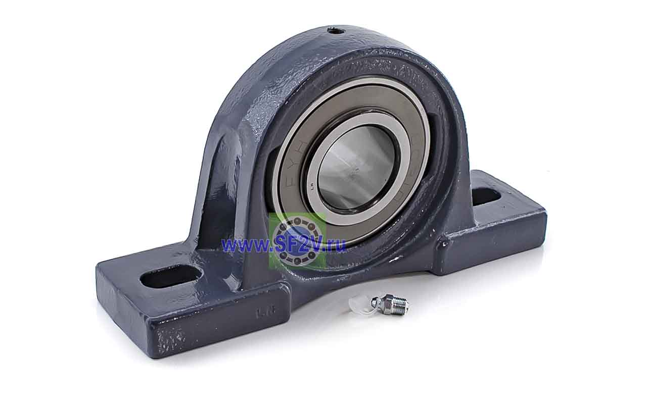 UCP - Подшипник с корпусом в сборе. Подшипник типа UC и подшипниковый корпус типа P - не разъемный, стационарный, фланцевый корпус с двумя отверстиями для крепежных болтов, выполненный из литого чугуна, снабжен ниппелем для проведения сервисных работ по замене смазки.