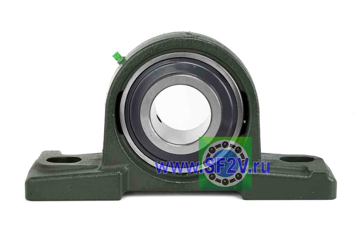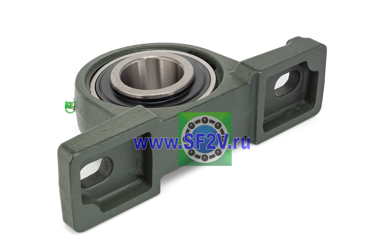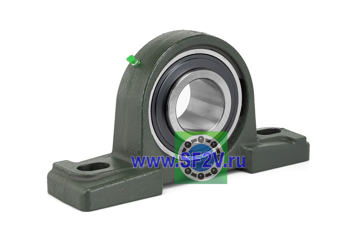 UCP - Подшипник с корпусом в сборе. Подшипник типа UC и подшипниковый корпус типа P - не разъемный, стационарный, фланцевый корпус с двумя отверстиями для крепежных болтов, выполненный из литого чугуна, снабжен ниппелем для проведения сервисных работ по замене смазки.