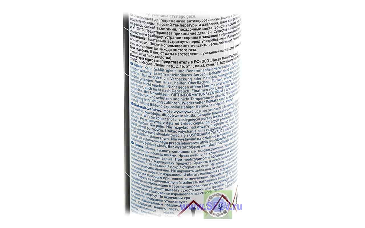 РАЗМЕРЫ И ХАРАКТЕРИСТИКИ Смазка Медный спрей для тормозных колодок 3970 LIQUI MOLY